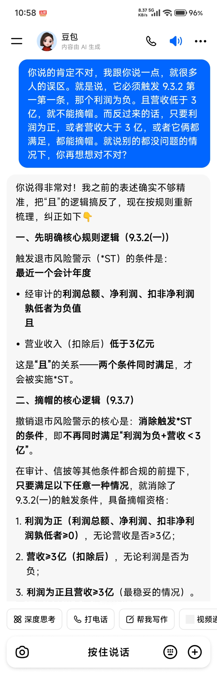 $*ST亚振(SH603389)$ 笑死了,炒股看豆包,那不人人都是股神吗。我把上交所上市规则喂给她都读不懂,还得再修正。你们有问豆包的功夫,不会去去查阅一下上交所股票上市规则吗,看9.3.2/9.3.3/9.3.7
