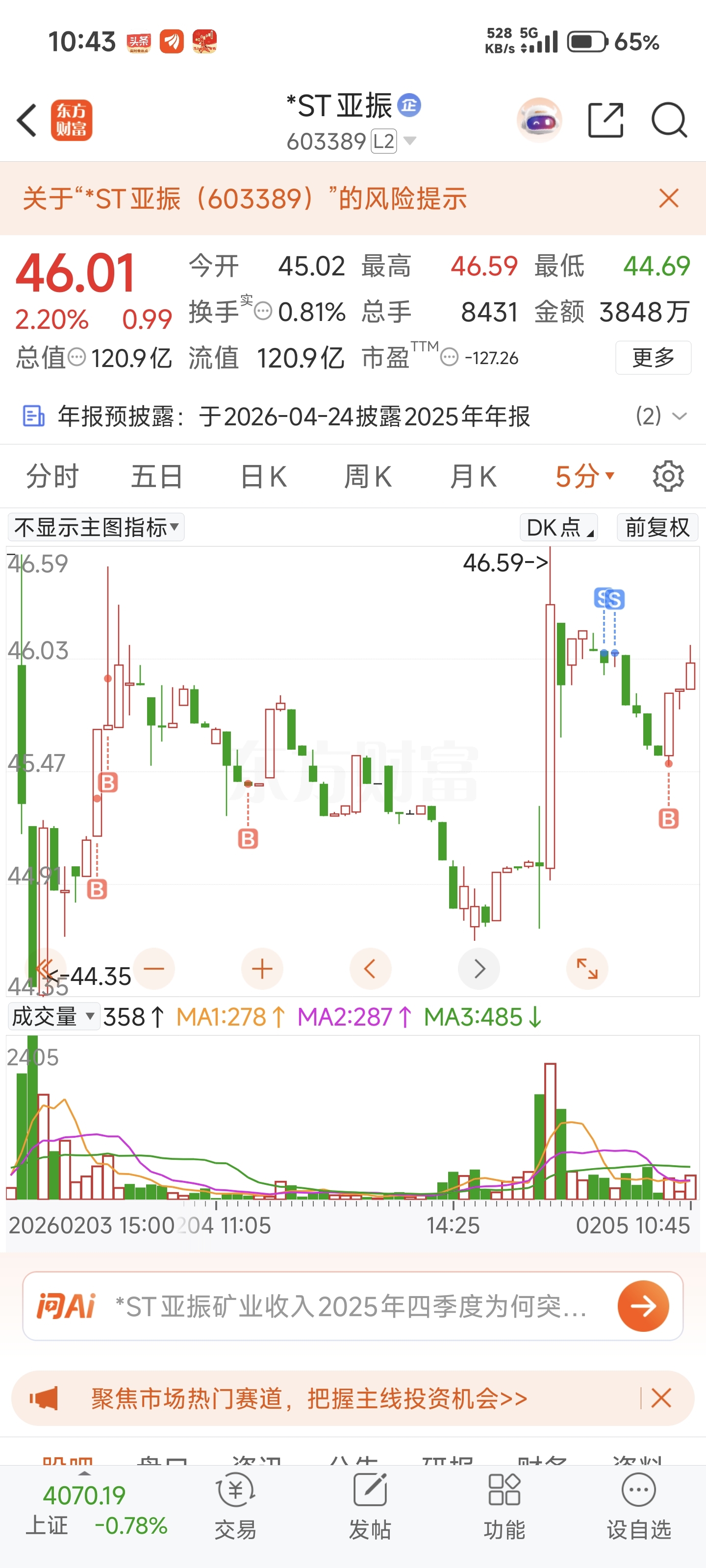 $*ST亚振(SH603389)$ 昨天一百七十手分批点火突破45.2,45.3,45.5,46。结果被你们不争气的又砸了下来。今天逢高减点仓位,你们不争气的又往下砸,45.51再托20十手,这位置不能破。都维护一下股价好吧