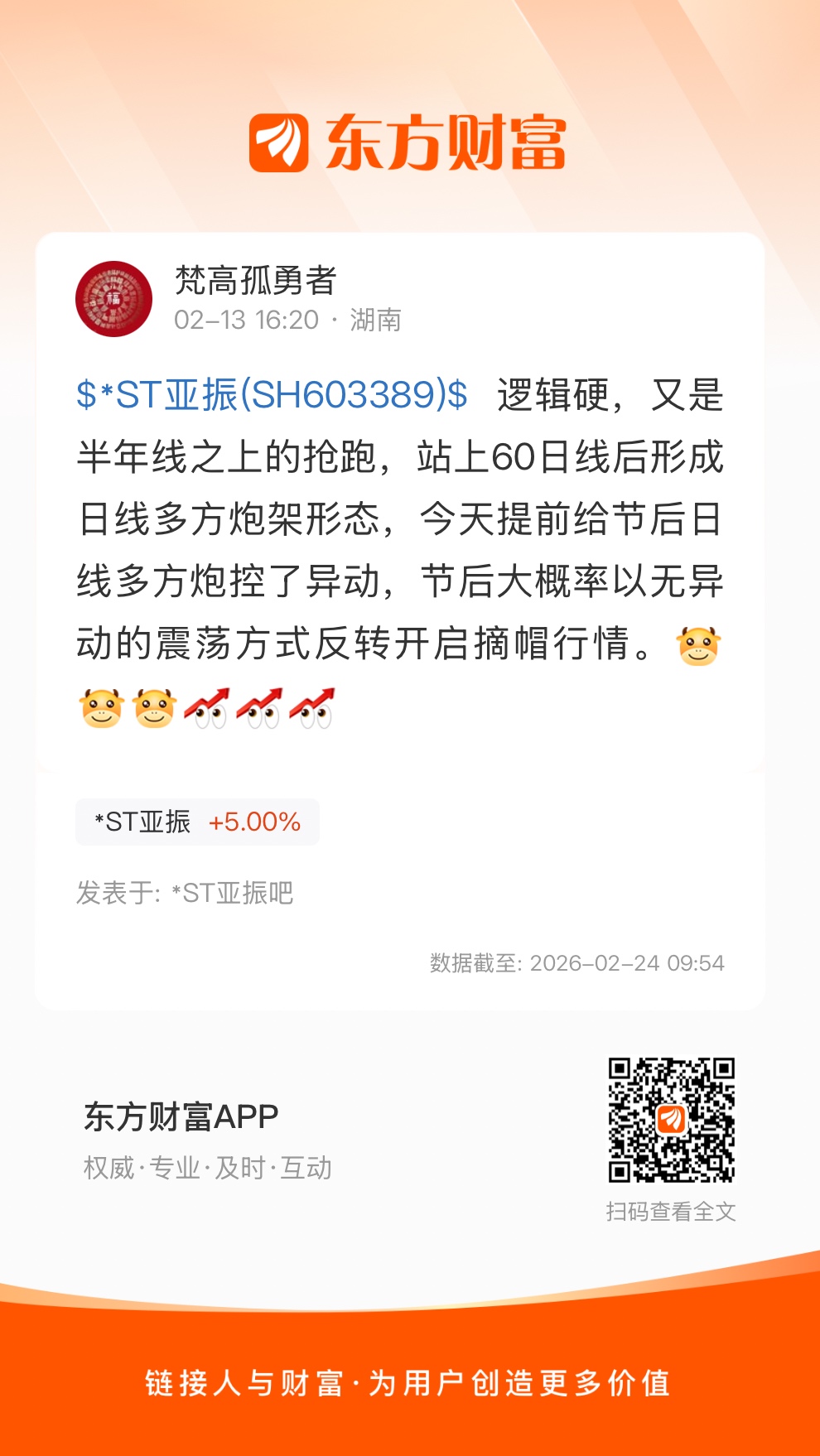 $*ST亚振(SH603389)$ 逻辑硬,又是半年线之上的抢跑,站上60日线后形成日线多方炮架形态,今天提前给节后日线多方炮控了异动,节后大概率以无异动的震荡方式反转开启摘帽行情。