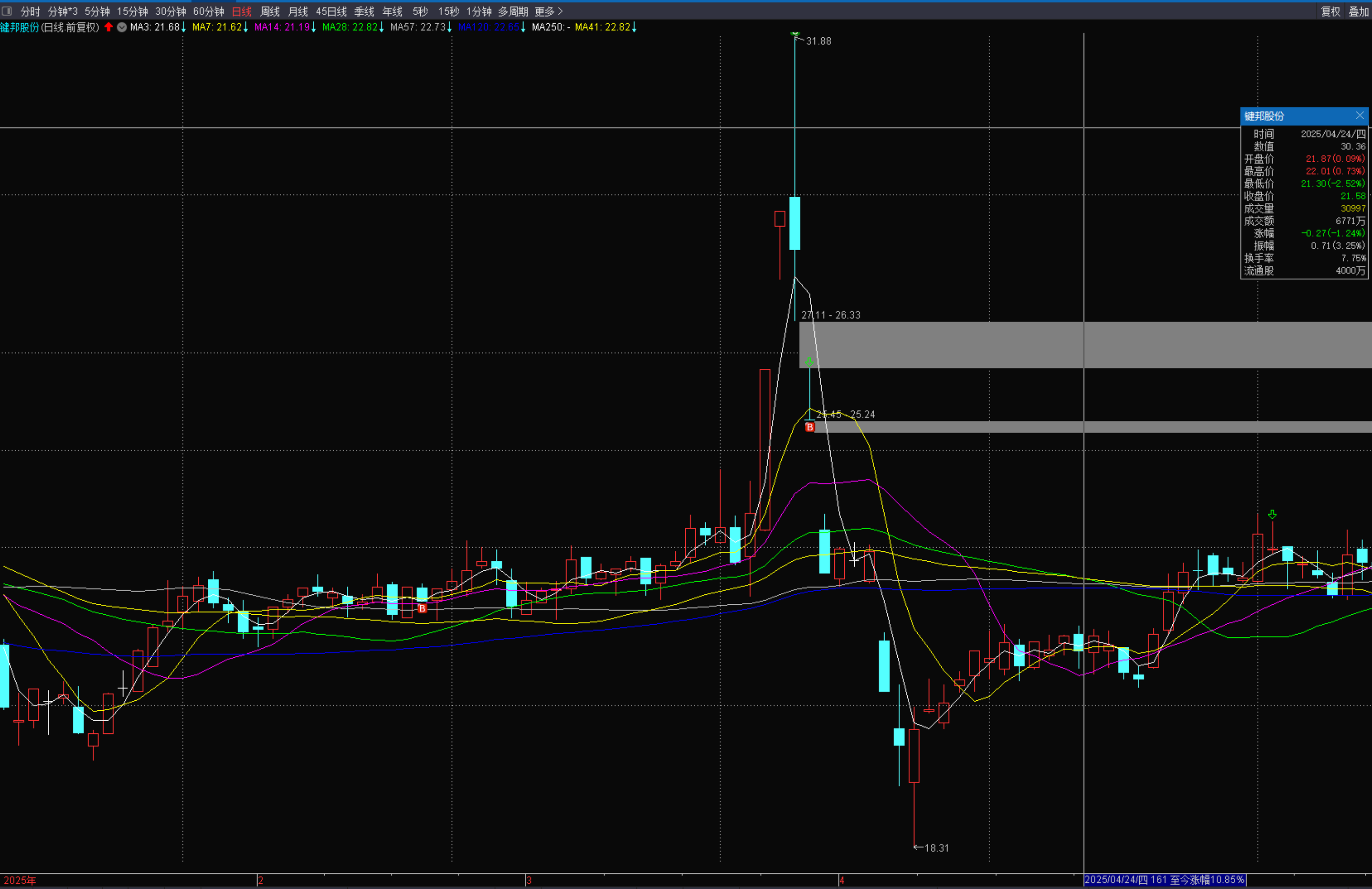 键邦股份抢反弹的惨痛经历,浪费三个月的行情才在31.5元附近获利了结。散户只有下跌大量时进,做好两手准备,{当初三涨停跑的,两跌停后急于抢反弹跌停板进场,但散户当天买当天跑不出,结果深套3个月}