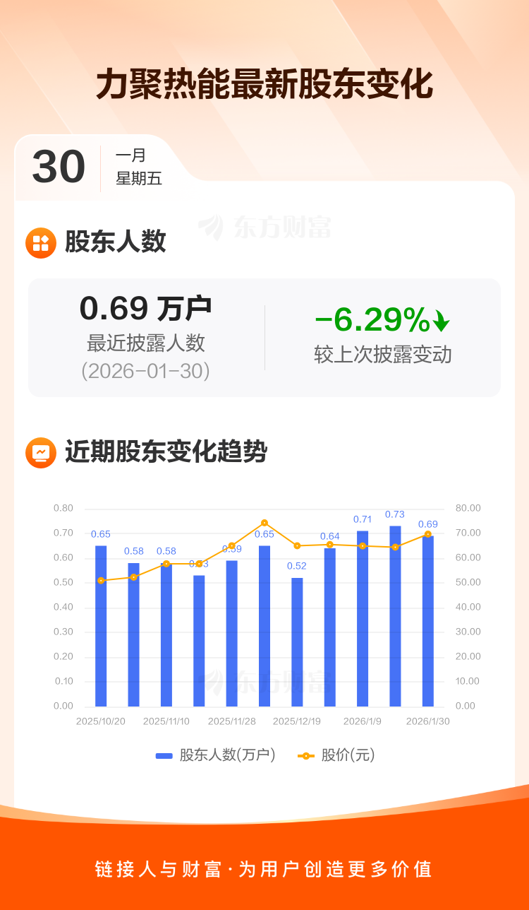 力聚热能:截至1月30日最新股东户数6882户,较上期减少6.29%