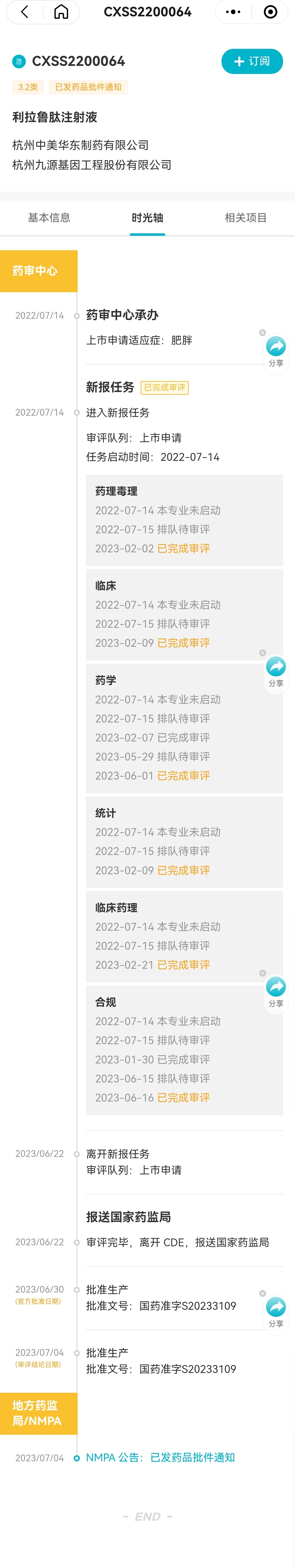 根据当时新闻“2023年3月7日,国家药品监督管理局药品审评中心官网显示,两个和肥胖适应症相关的上市申请被暂停,受理代号分别为CXSS2200065和CXSS2200064的利拉鲁肽注射液审评状态为“暂停”。”可以看看当时评审情况(药学和合规二次审批了)和最终获批的时间点(2023年7月初),以供参考