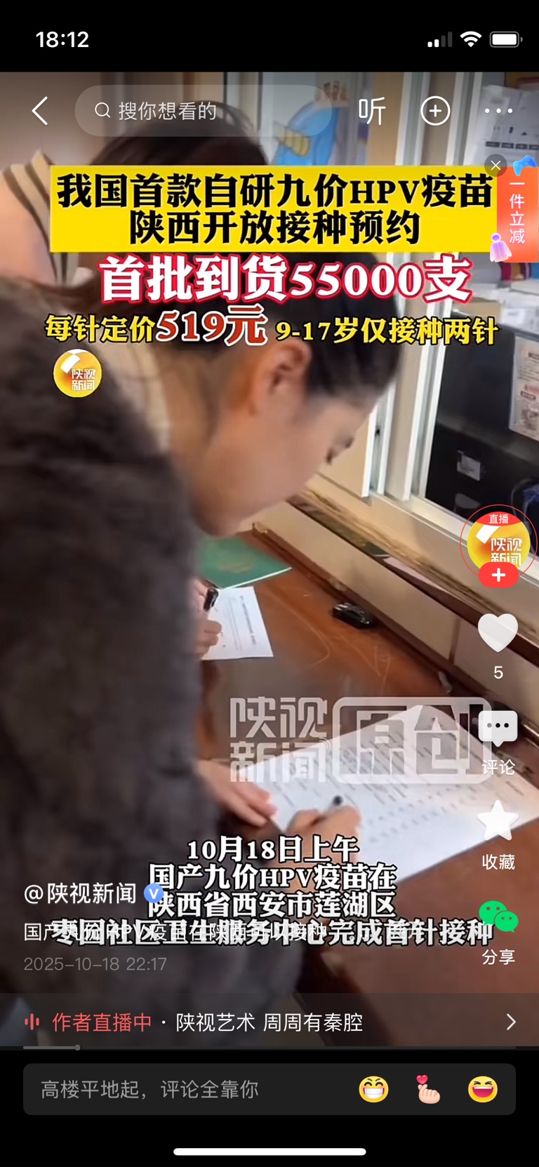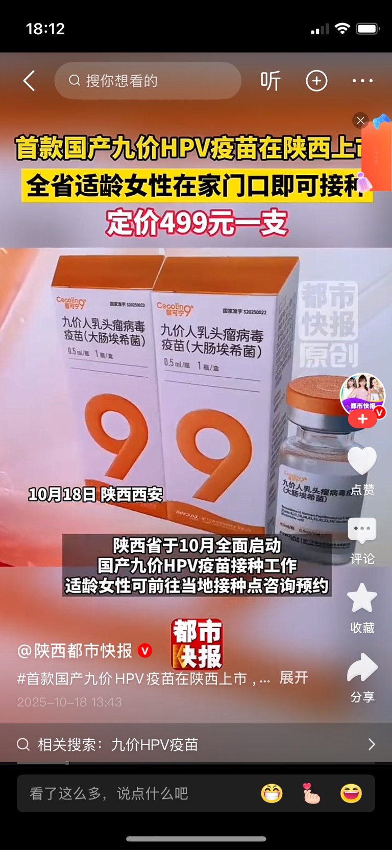 国产九价疫苗陕西省18日正式开打,首批到货55000支。