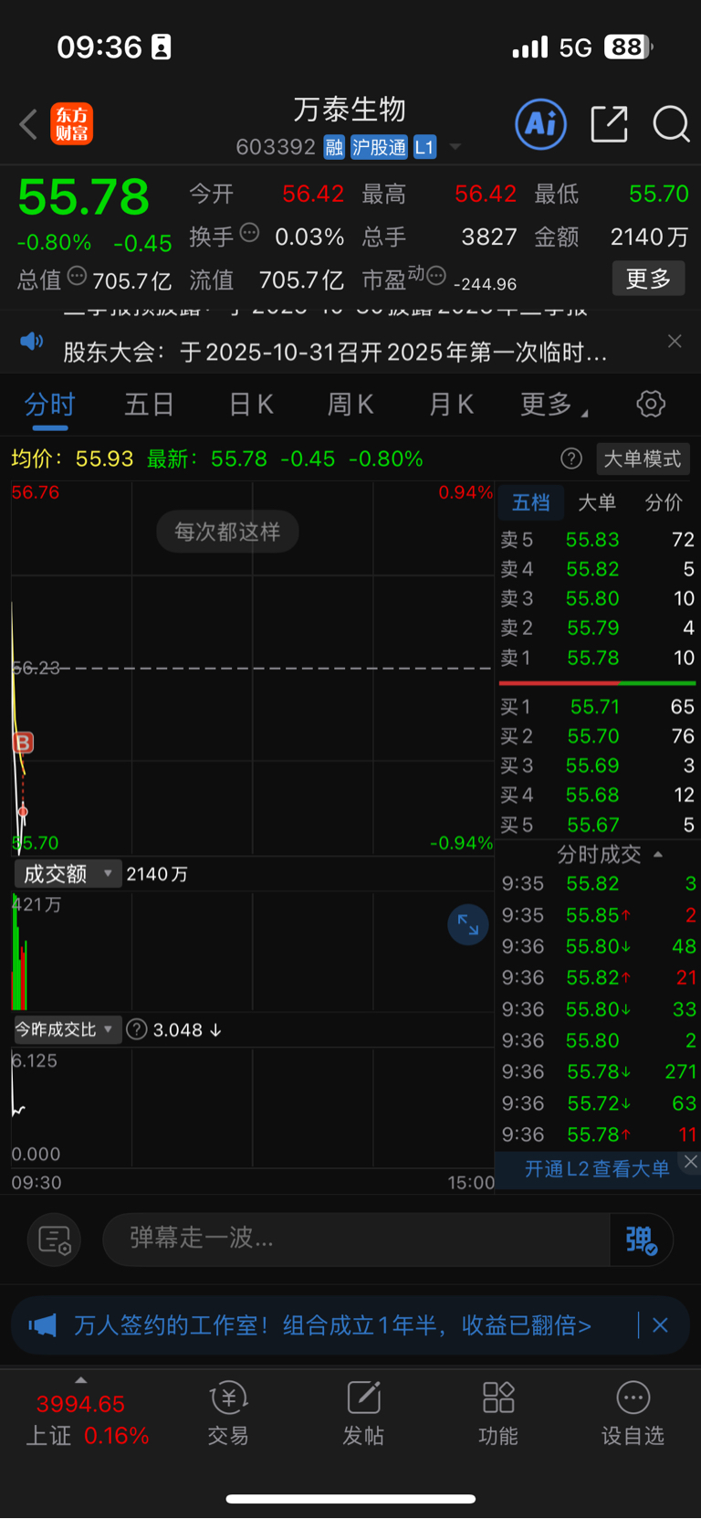 $万泰生物(SH603392)$ 昨天56.8卖出5000股,今天55.8买入5000股,万泰被我稳稳拿捏拿捏