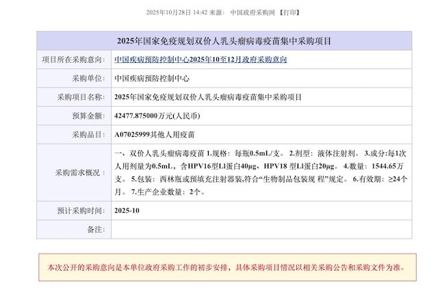 随着HPV疫苗纳入国家免疫规划,10月28日下午,中国政府采购网公布了2025年
