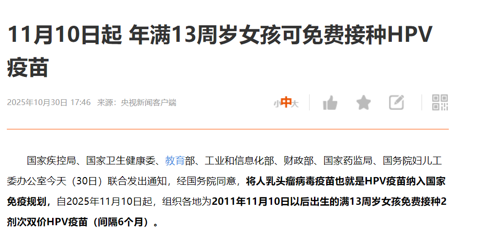11月10日起,年满13周岁的女孩可免费接种HPV疫苗