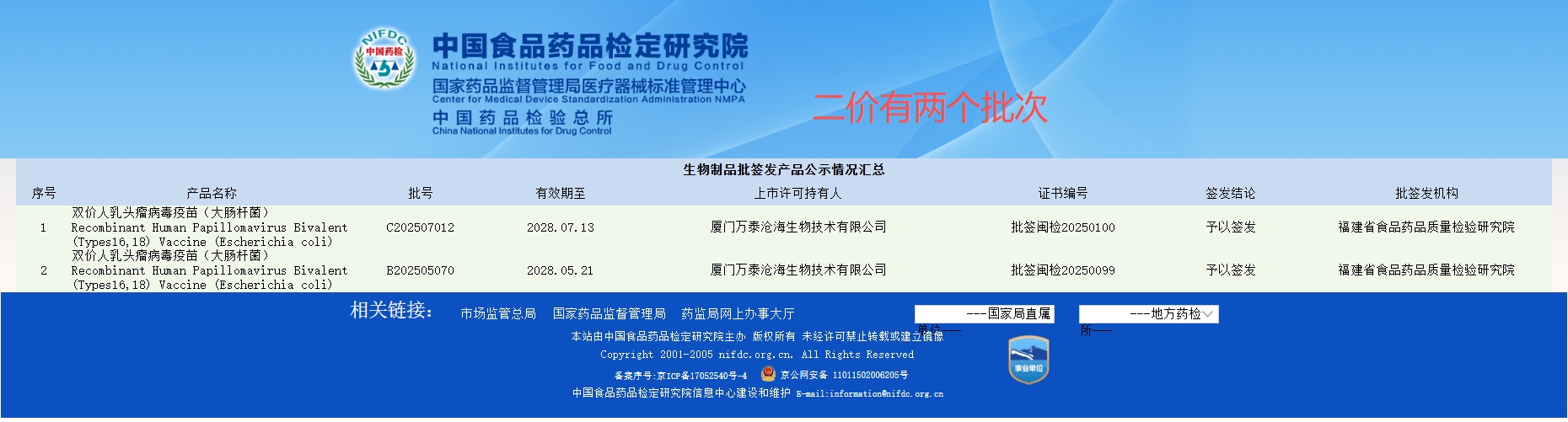 这次还是没有九价批签发数据,二价有两个批签发。
