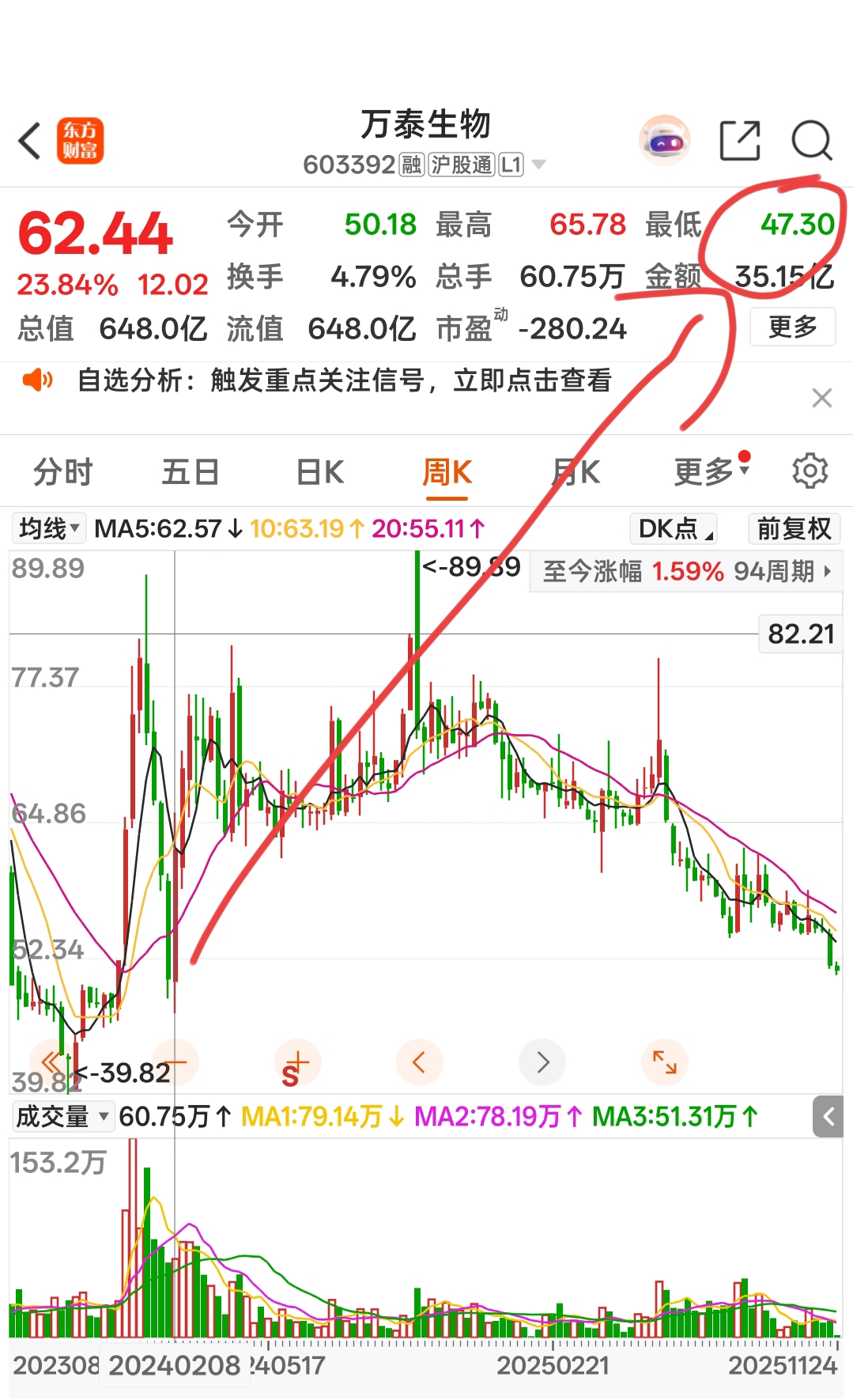 $万泰生物(SH603392)$ 47.3之前,不要买入,这老硬币的套路,破新低才会拉