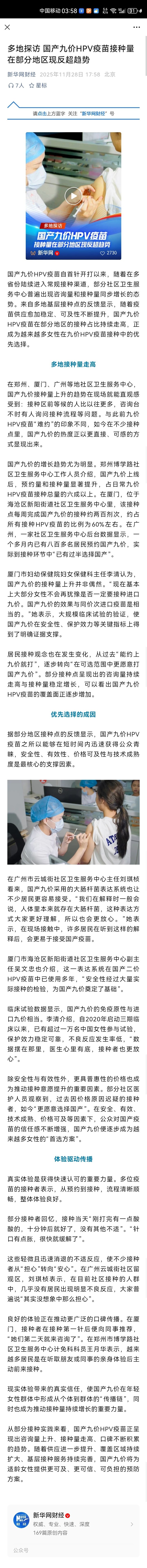 $万泰生物(SH603392)$ 新华网财经:多地探访,国产九价HPV疫苗接种量在部分地区现反超趋势