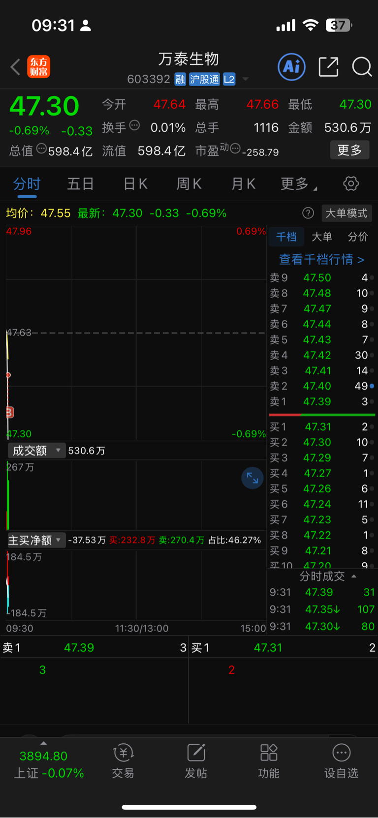 $万泰生物(SH603392)$ 卧蚕,47.5还真成交了。