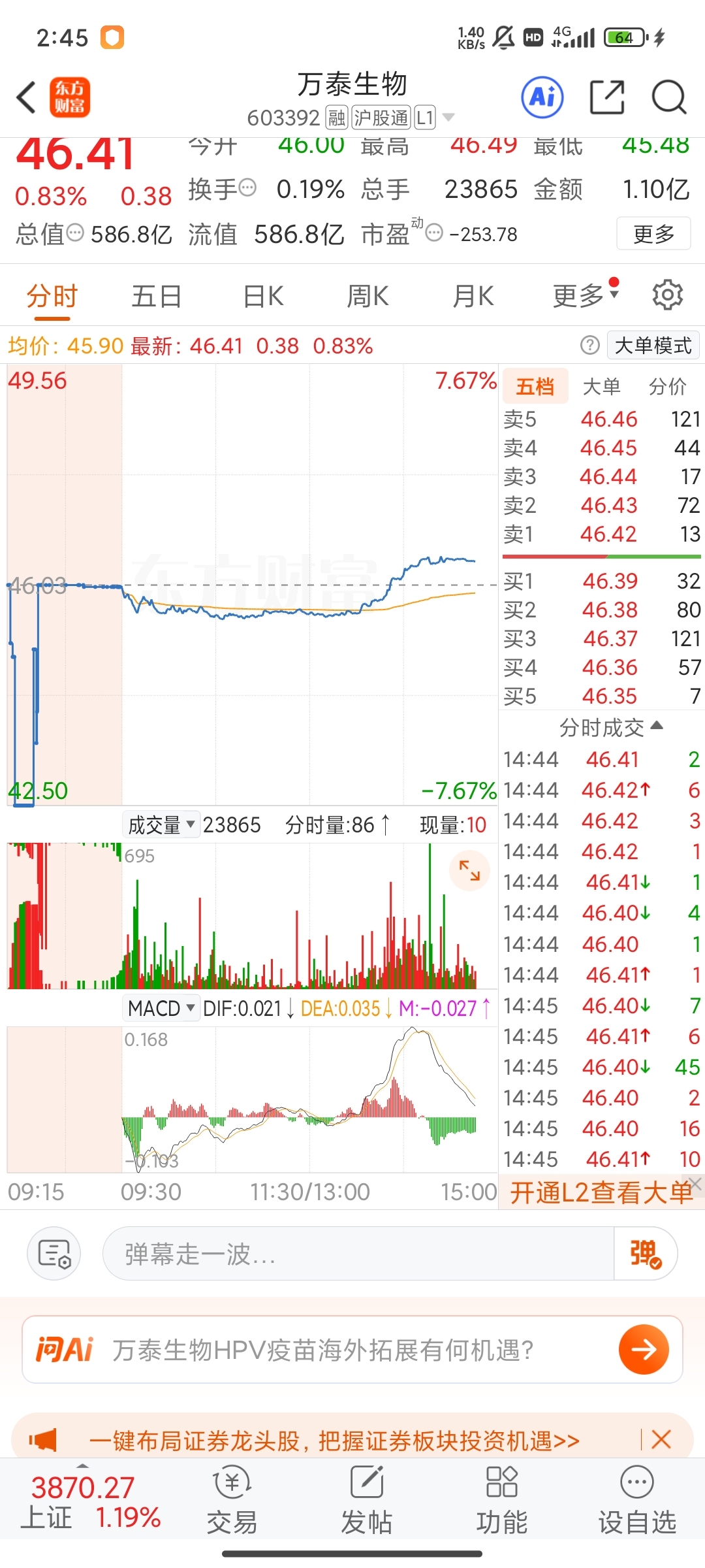 $万泰生物(SH603392)$ 121手挂单各一个。