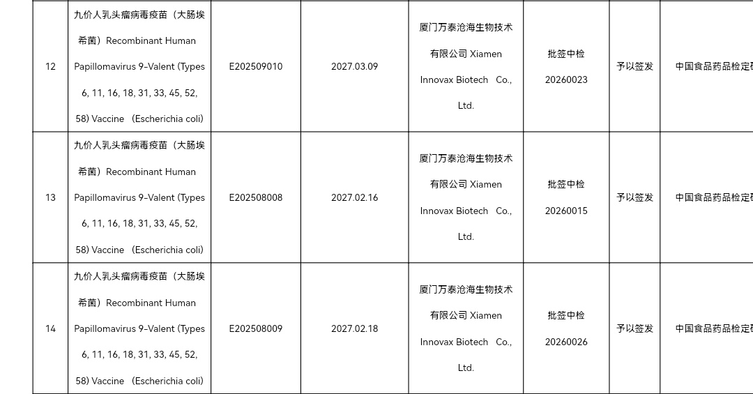 批号是唯一的,截至目前已公开的资料显示,万泰生物九价疫苗共批签发16批次,批号2