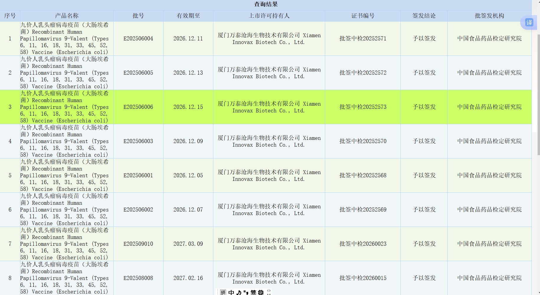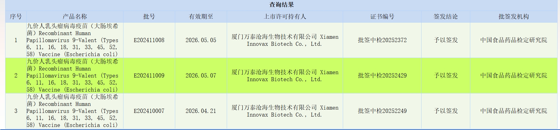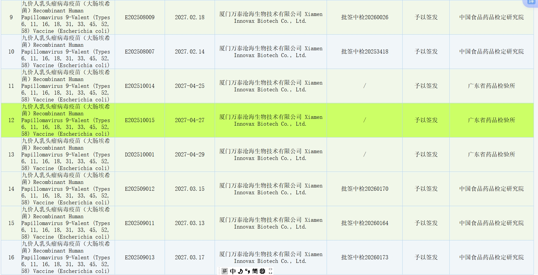 截止到目前,中检院公布的九价批签发一共19批