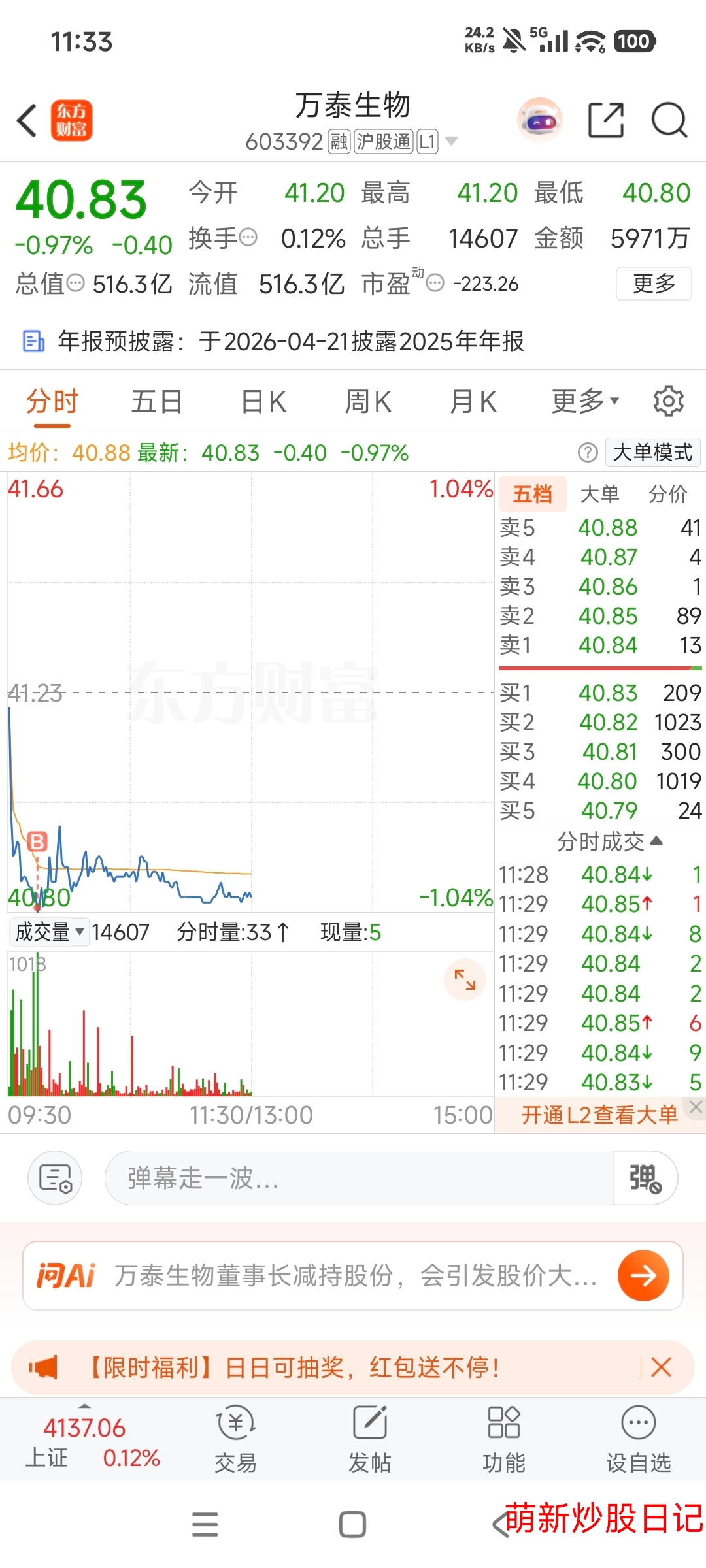 $万泰生物(SH603392)$ 今天继续建仓万泰生物,下午如果能跌到40.4左右就再买一点,总感觉万泰生物现在就是底部区域了,问题不大