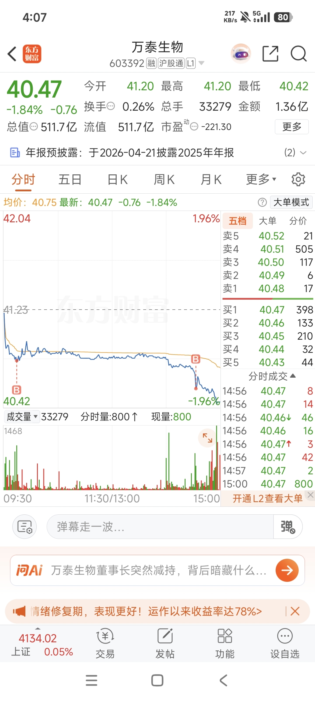 $万泰生物(SH603392)$ 今天建仓差不多完成了,目前3成仓,期待明天和年后能有跨年行情,万泰生物的股民基本都在亏钱,短线看也的确是超跌了,明天要是再跌最多加仓到5成仓,然后等年后行情了