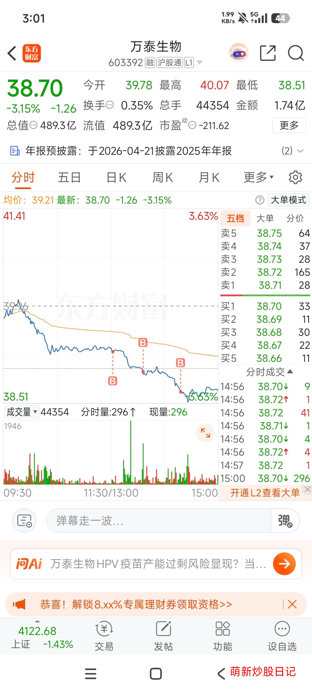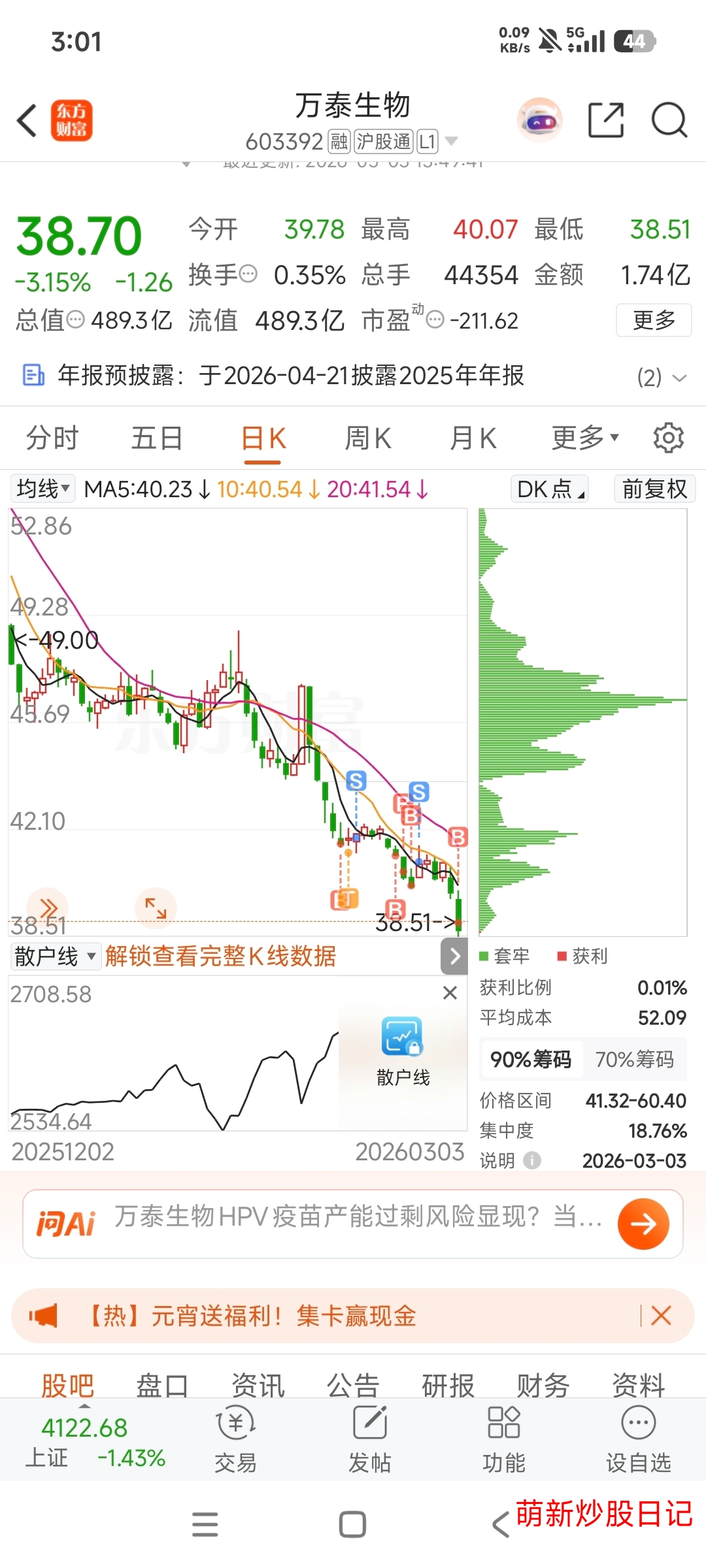 今天是第三次玩万泰生物了,前两次虽然赚的不多但都是赚钱走的,希望这次也能赚到小钱钱。