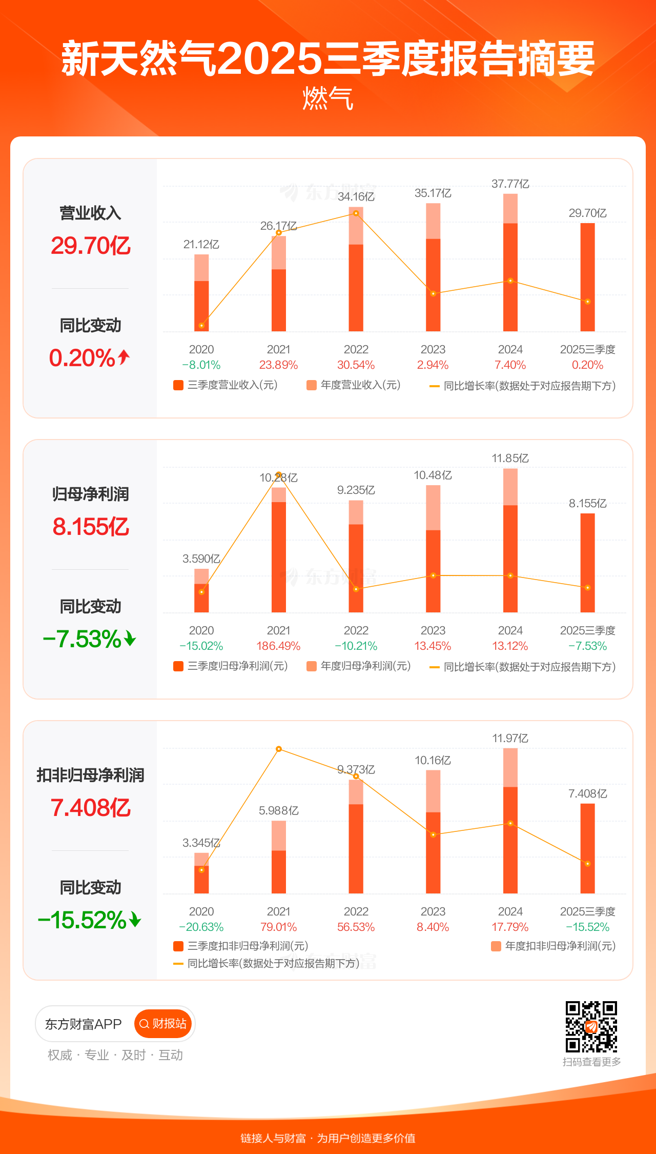 新天然气10月30日发布2025年三季报显示,公司前三季实现营业收入29.70亿元,同比增长0.20%;归母净利润8.15亿元,同比下滑7.53%;扣非归母净利润7.41亿元,同比下滑15.52%