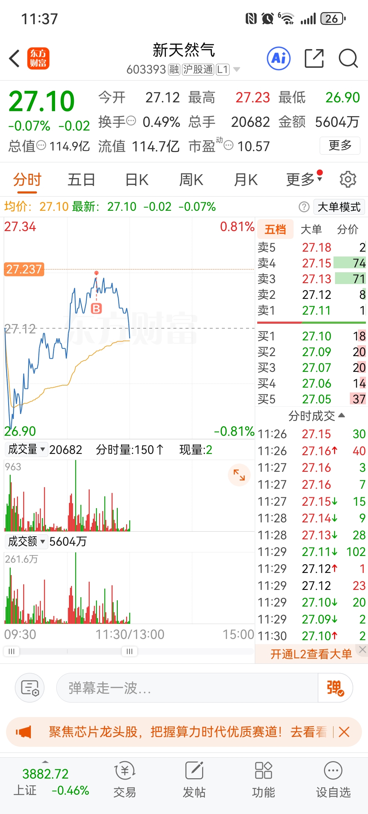 $新天然气(SH603393)$ 厉害,观察了一早上没进去,进去就是虚空买点,佩服,明天割肉