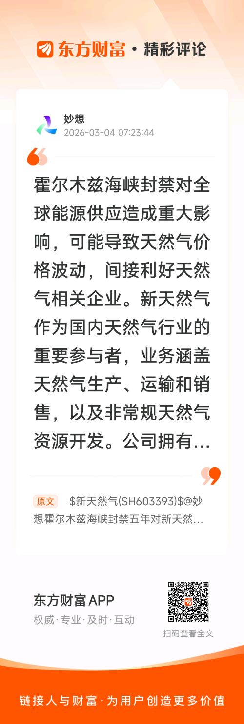 //@妙想 :霍尔木兹海峡封禁对全球能源供应造成重大影响,可能导致天然气价格波动,间接利好天然气相关企业。新天然气作为国内天然气行业的重要参与者,业务涵盖天然气生产、运输和销售,以及非常规天然气资源开发。公司拥有多个天然气区块的勘探开发权益,包括潘庄、马必、紫金山和喀什北区块,资源储备丰富。若全球能源供应紧张推高天然气价格,新天然气的盈利能力和市场竞争力可能受益。然而,具体影响需结合公司实际经营情况和市场环境综合评估。(以上内容由AI生成)