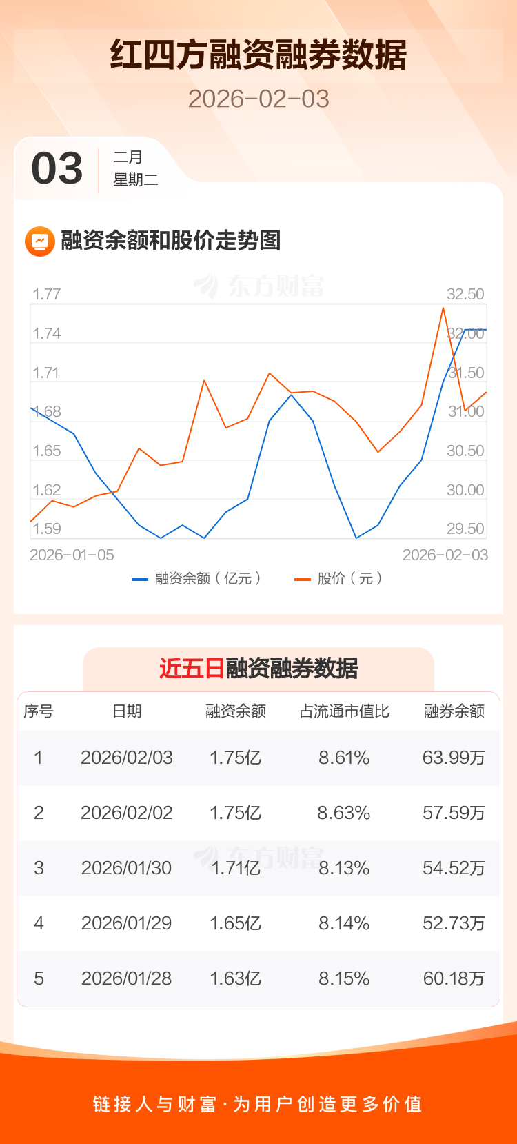 交易所最新数据显示,红四方于2026年2月3日获融资买入1043.80万元,融资偿还957.76万元,当日融资净买入86.04万元。目前,该股融资余额1.75亿,占流通市值比例为8.61%。