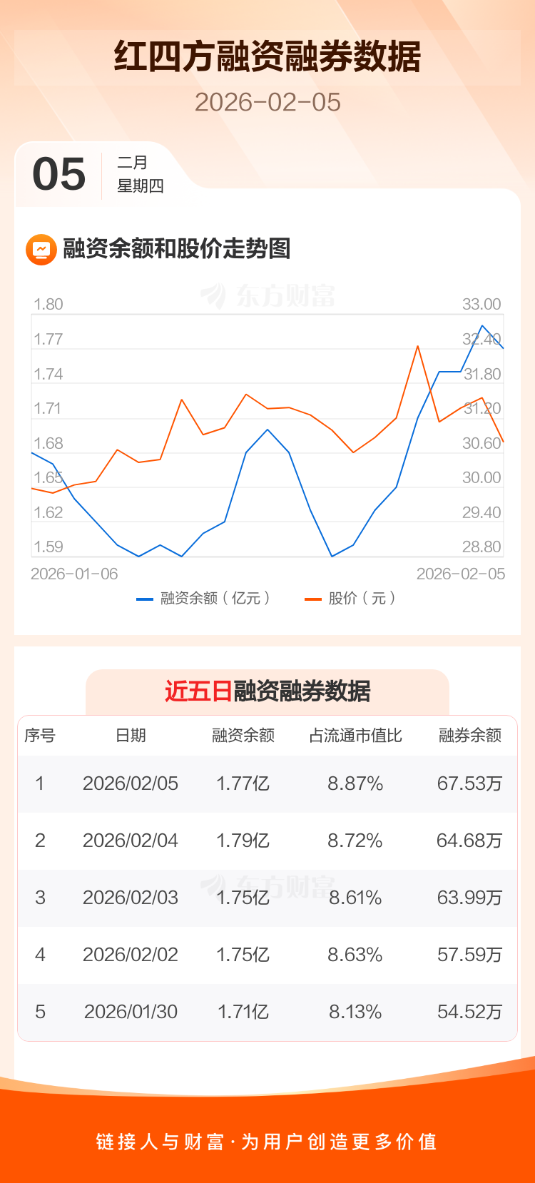 交易所最新数据显示,红四方于2026年2月5日获融资买入608.04万元,融资偿还746.54万元,当日融资净偿还138.51万元。目前,该股融资余额1.77亿,占流通市值比例为8.87%。