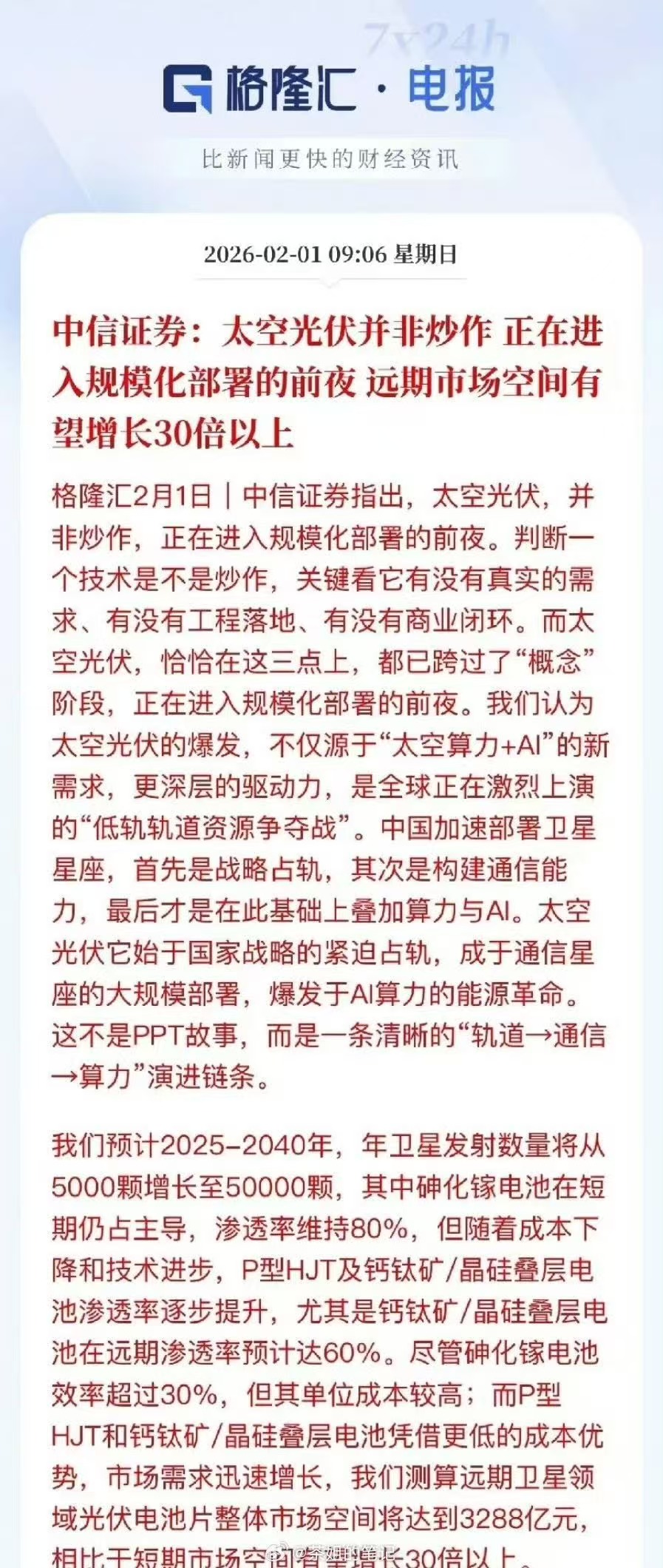 中信证券:太空光伏并非炒作正在进入规模化部署前夜 远期市场空间有望增长30倍以上