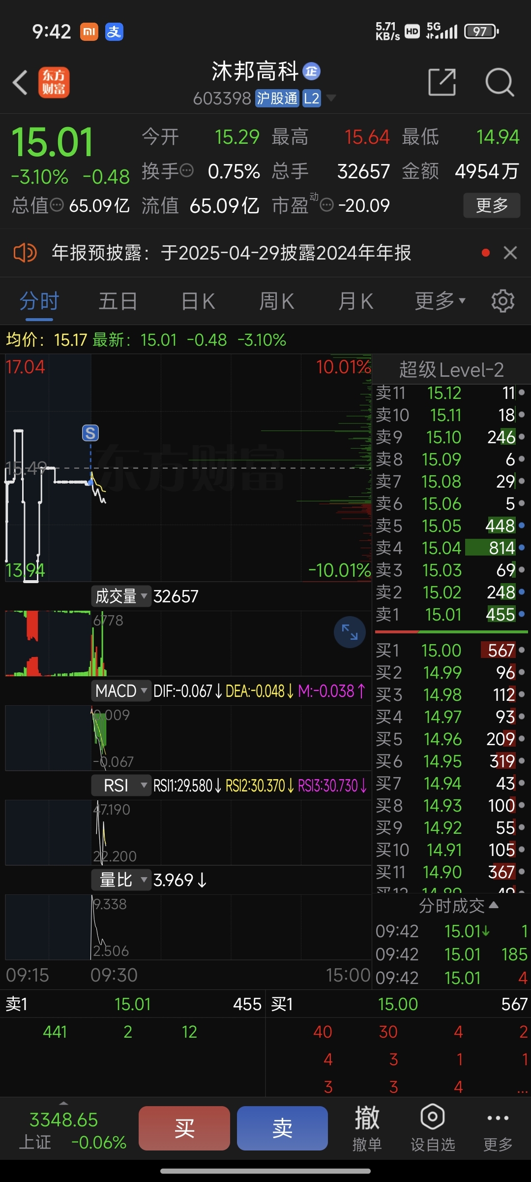 $沐邦高科(SH603398)$ 竞价出的刚开始还排大腿少卖三毛钱现在一看还算明智