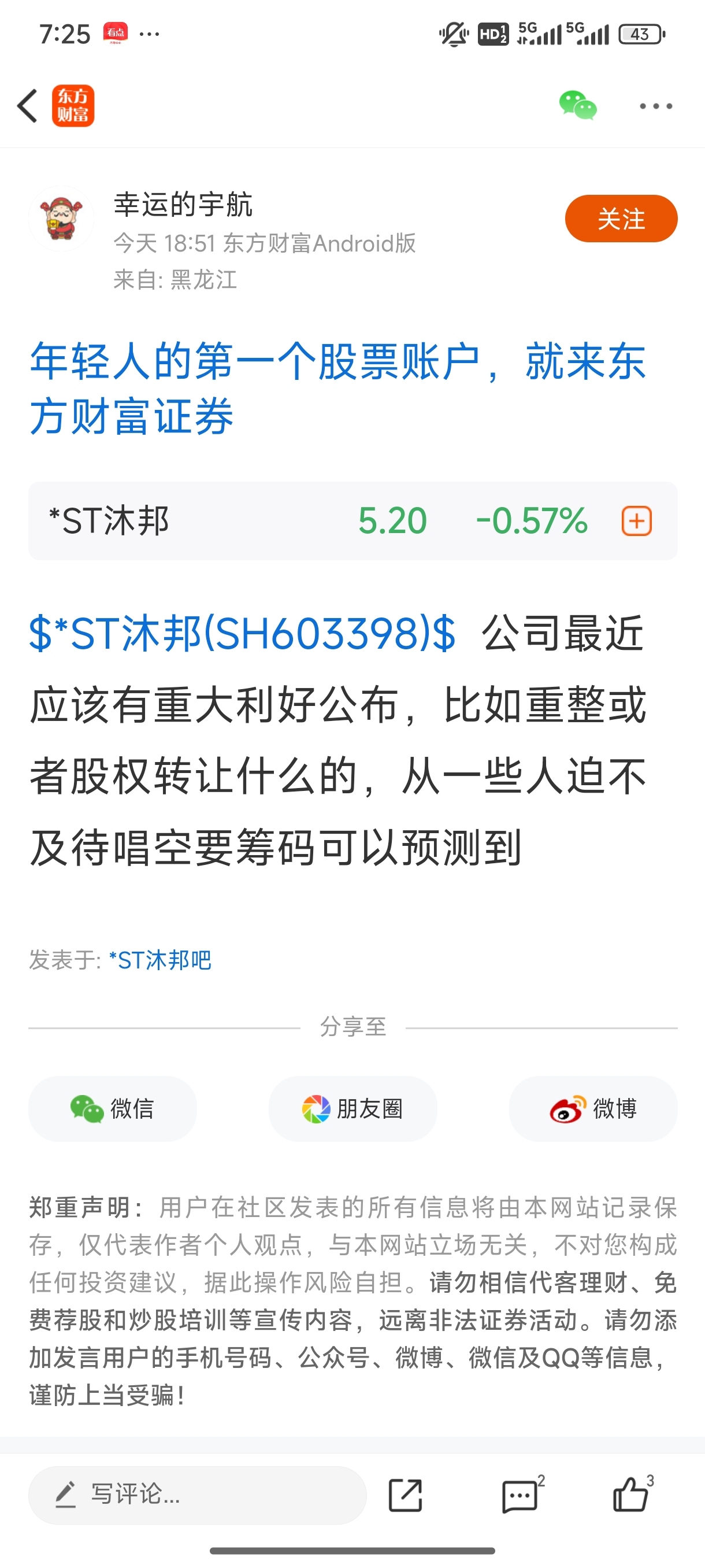 温馨提示: 1.根据《证券法》规定,禁止编造、传播虚假信息或者误导性信息,扰乱证券市场;2.用户在本社区发表的所有资料、言论等仅代表个人观点,与本网站立场无关,不对您构成任何投资建议。用户应基于自己的独立判断,自行决定证券投资并承担相应风险。《东方财富社区管理规定》