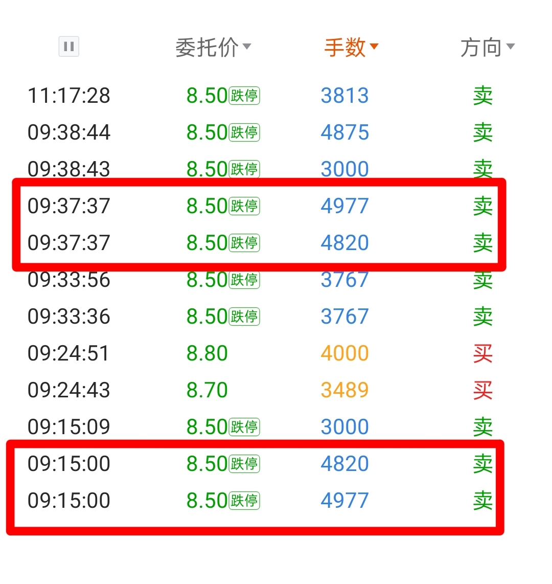 $*ST沐邦(SH603398)$ 都是这些资金在引导散户卖出。自己反复撤单挂单,目前这两笔又撤单了。这只是两个大的,小单挂单撤单的很多很多。跌停越多越好,极致恐慌后反转才彻底。
