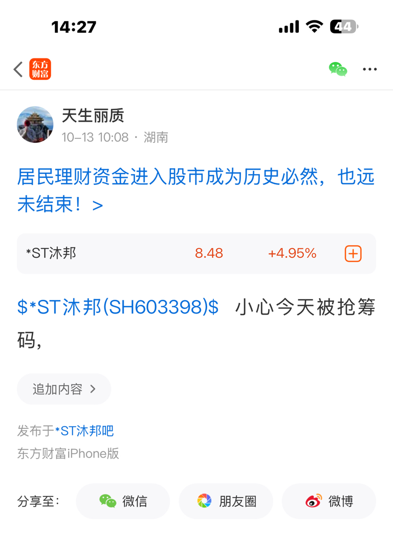 $*ST沐邦(SH603398)$ 早上江西同学给我发的微信,然后我好心提醒一下,我相信厚德载物,好人有好报