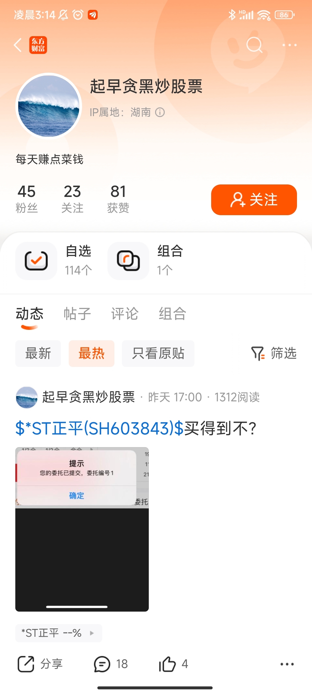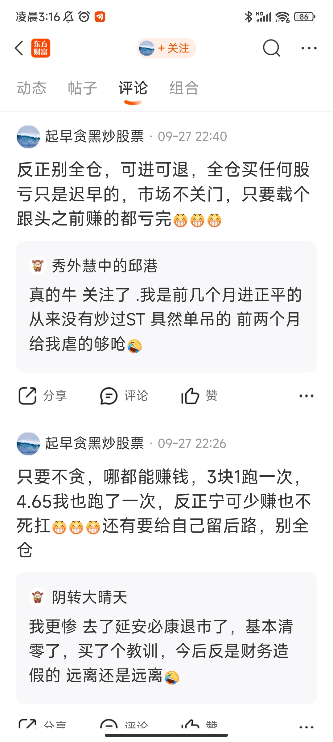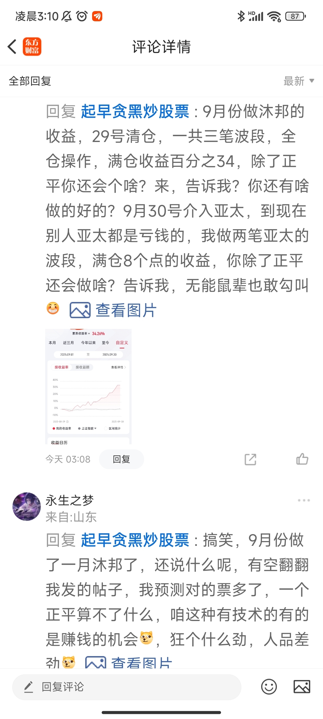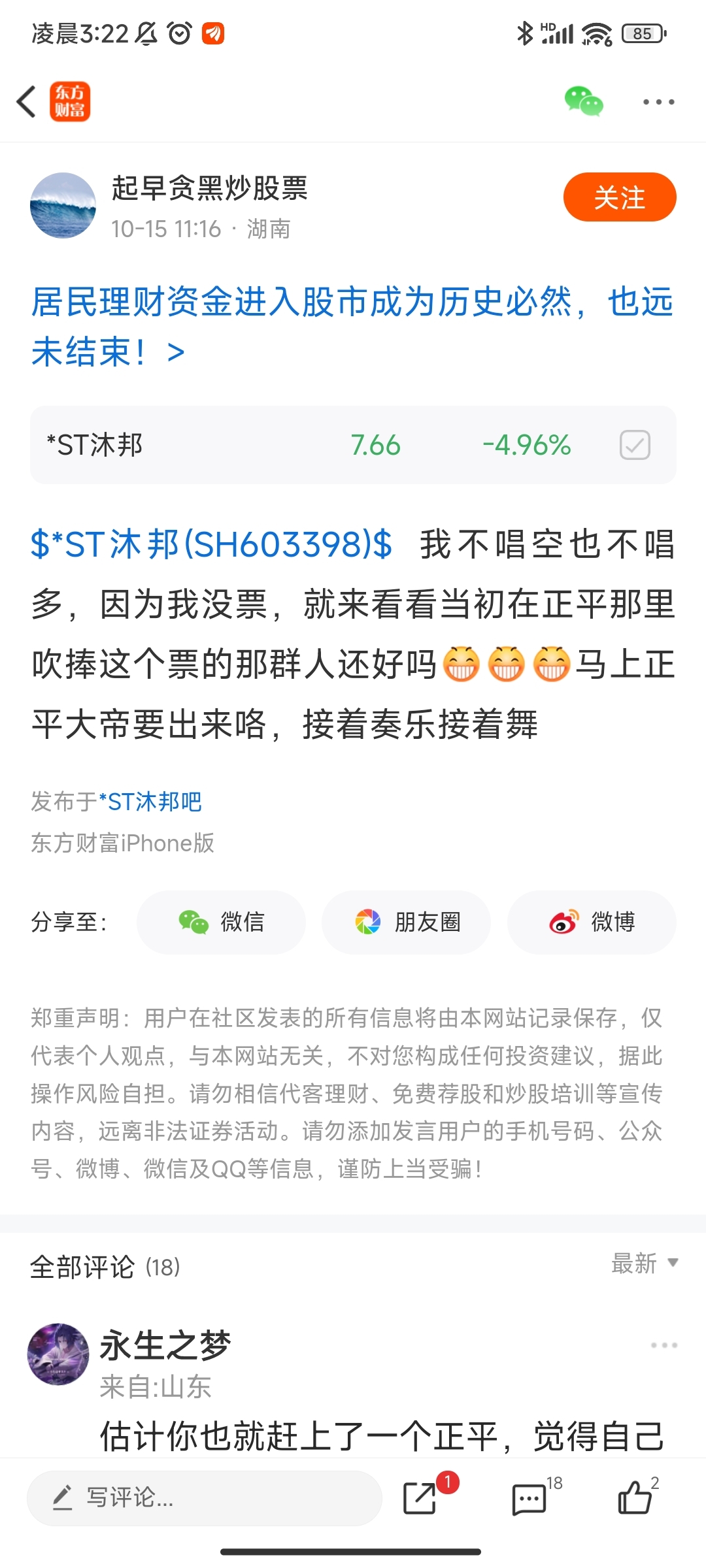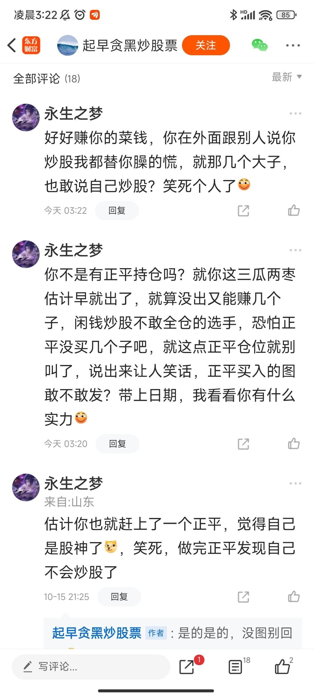 $*ST沐邦(SH603398)$ 就这个人,小人得志的嘴脸真笑死个人,买又没买多少正平,他还狂上了,你正平狂跌调整的时候,你沐邦跌正四连涨停风头正劲呢,辉煌时刻谁都有,莫把一刻当永久,更何况你这三瓜两枣,闲钱炒股不敢全仓的飞物,看你这飞物的股吧发帖 言论我都想笑,出去在外面别跟人说自己炒股,那几个钢镚不够人笑话的