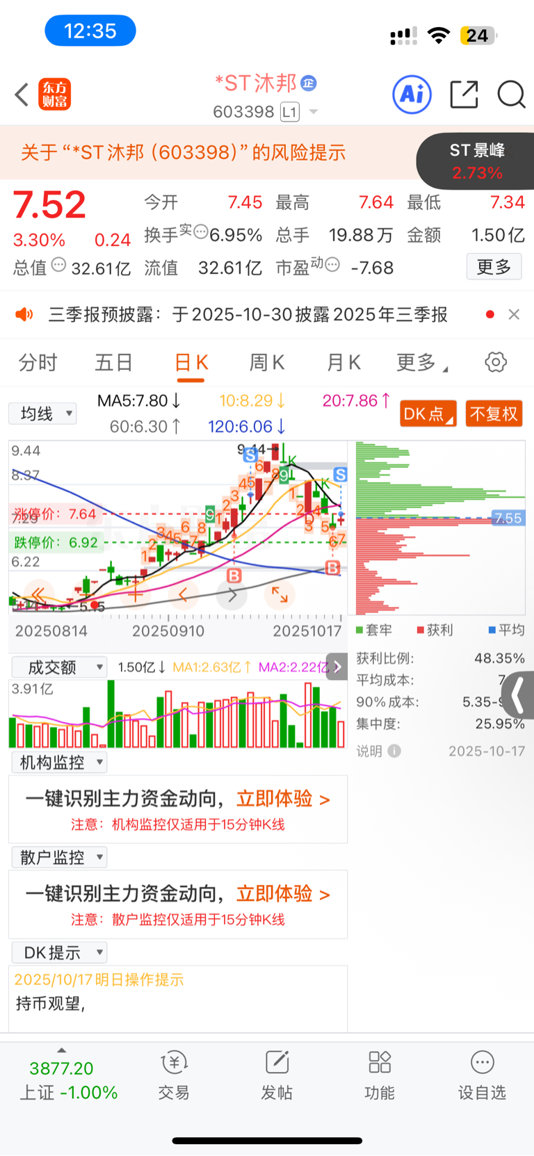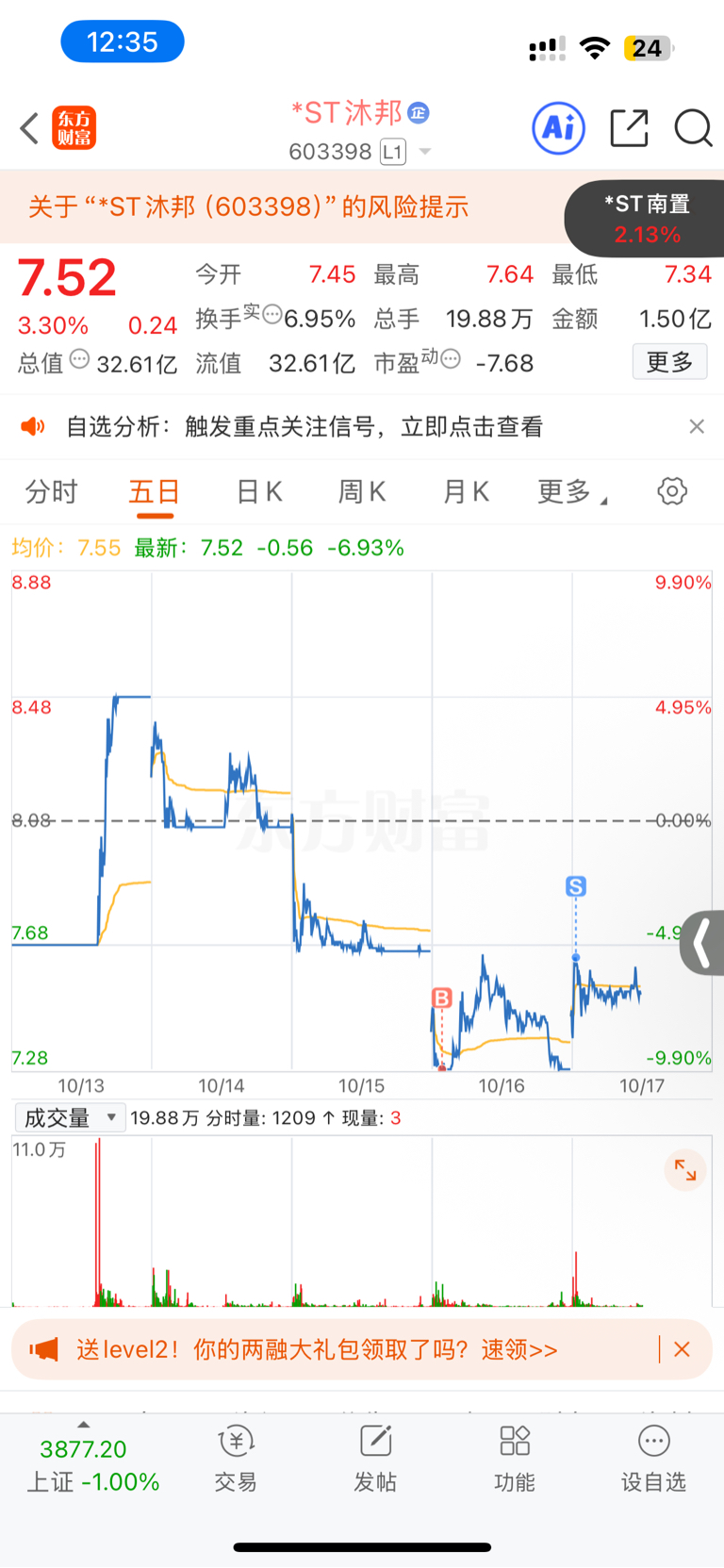 $*ST沐邦(SH603398)$ 封板不强势,先跑为敬。很多ST随大盘走势强洗,封停的也开大口,正平,华通都想买点,股友2选一怎么选,或者还有好推荐吗