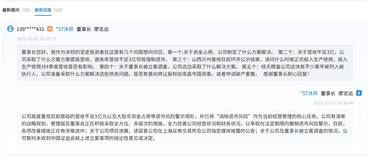 $*ST沐邦(SH603398)$ $*ST东易(SZ002713)$ $*ST正平(SH603843)$ 下面图片是今天在上证路演中心我发给董事长的提问,相信也有不少投资者想问的问题和我一样,不管怎么样,从回复内容来说,公司的态度还是非常积极,只是有些东西不可以轻易透露,作为投资者,我们坚定守好就行了。