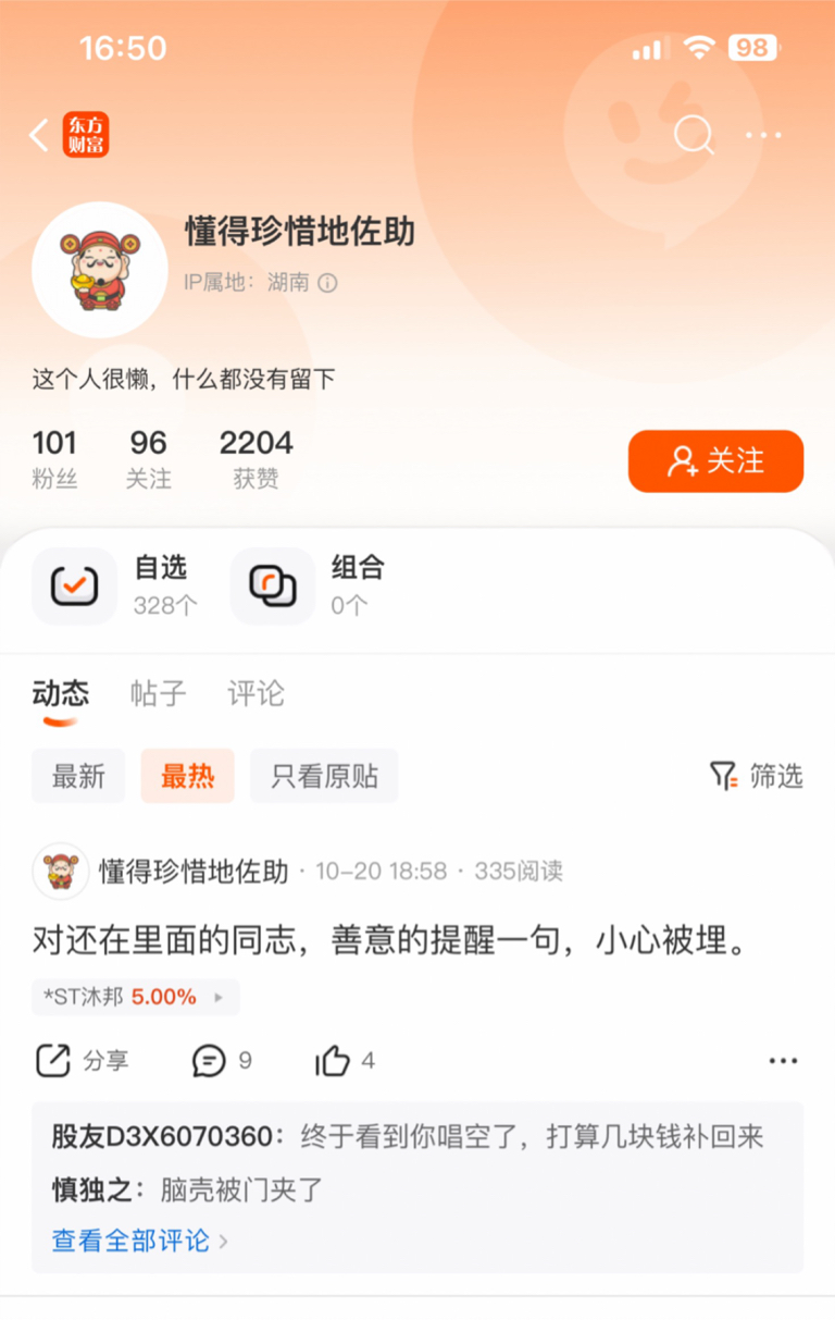 $*ST沐邦(SH603398)$ 个把月没来看了,这货怎么还在这个股吧乱叫啊,记得他是从4块多一直唱空的。