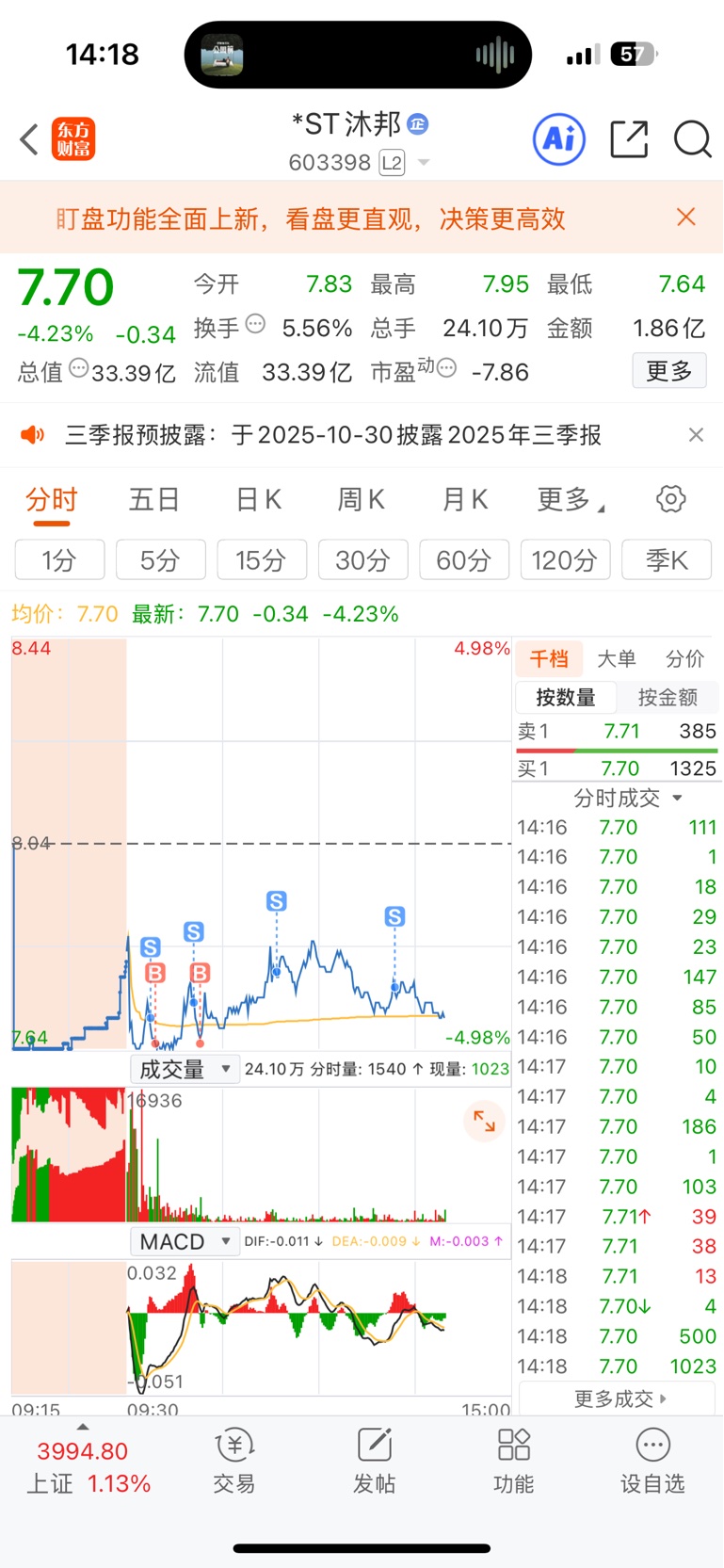$*ST沐邦(SH603398)$  今天估计跌停开,然后资金吸筹翘板,最后收盘依旧跌停