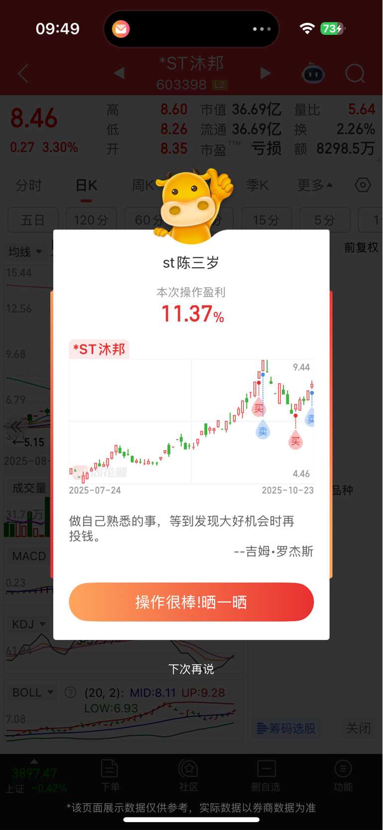 $*ST沐邦(SH603398)$ 我这买卖点怎么样