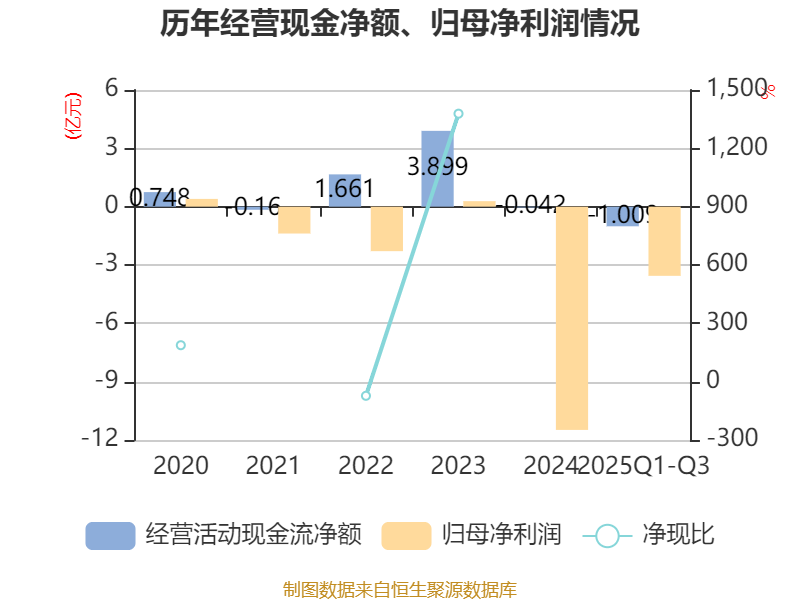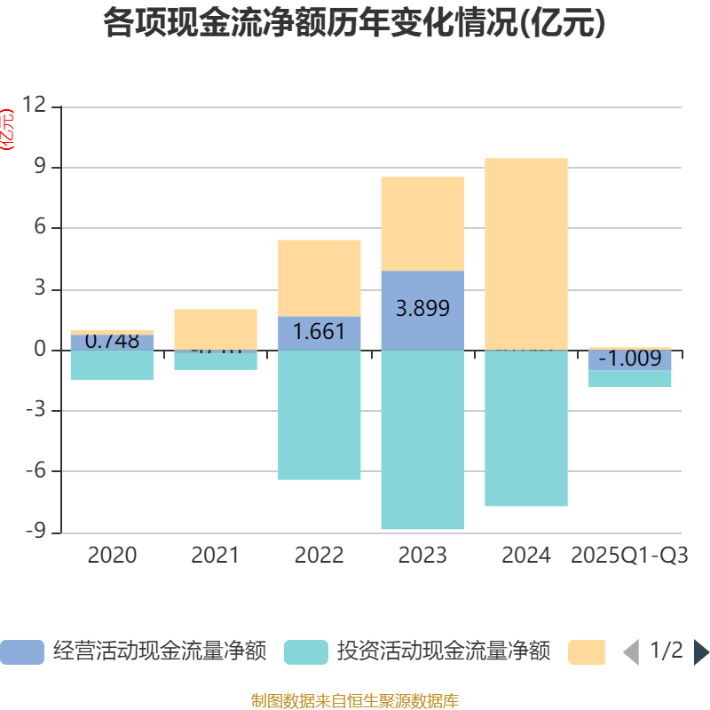 2025年前三季度,公司经营活动现金流净额为-1.01亿元,同比增加6602.87万元;筹资活动现金流净额1314.07万元,同比减少9.06亿元;投资活动现金流净额-8155.26万元,上年同期为-5.03亿元。