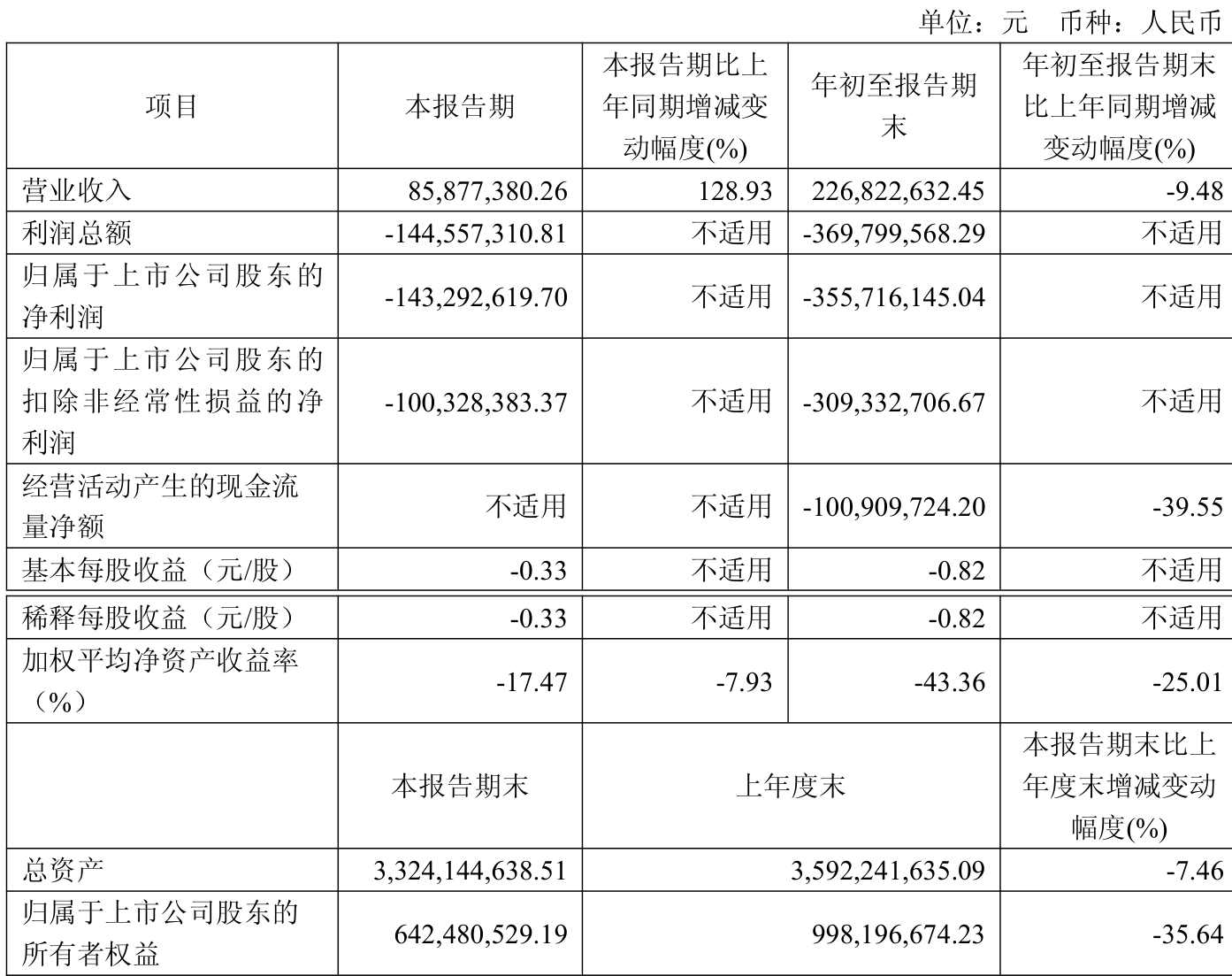 中证智能财讯 *ST沐邦(603398)10月30日披露2025年第三季度报告。前三季度公司实现营业总收入2.27亿元,同比下降9.48%;归母净利润亏损3.56亿元,上年同期亏损3.08亿元;扣非净利润亏损3.09亿元,上年同期亏损3.14亿元;经营活动产生的现金流量净额为-1.01亿元,上年同期为-1.67亿元;报告期内,*ST沐邦基本每股收益为-0.82元,加权平均净资产收益率为-43.36%。