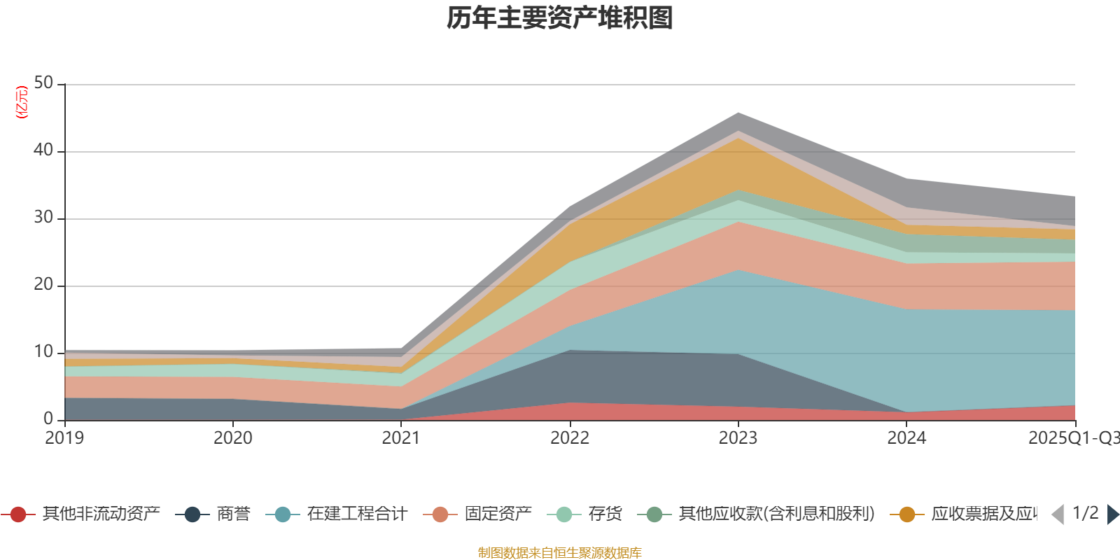 资产重大变化方面,截至2025年三季度末,公司货币资金较上年末减少81.23%,占公司总资产比重下降5.79个百分点;其他非流动资产较上年末增加90.41%,占公司总资产比重上升3.35个百分点;固定资产较上年末增加5.86%,占公司总资产比重上升2.73个百分点;其他应收款(含利息和股利)较上年末减少24.53%,占公司总资产比重下降1.38个百分点。