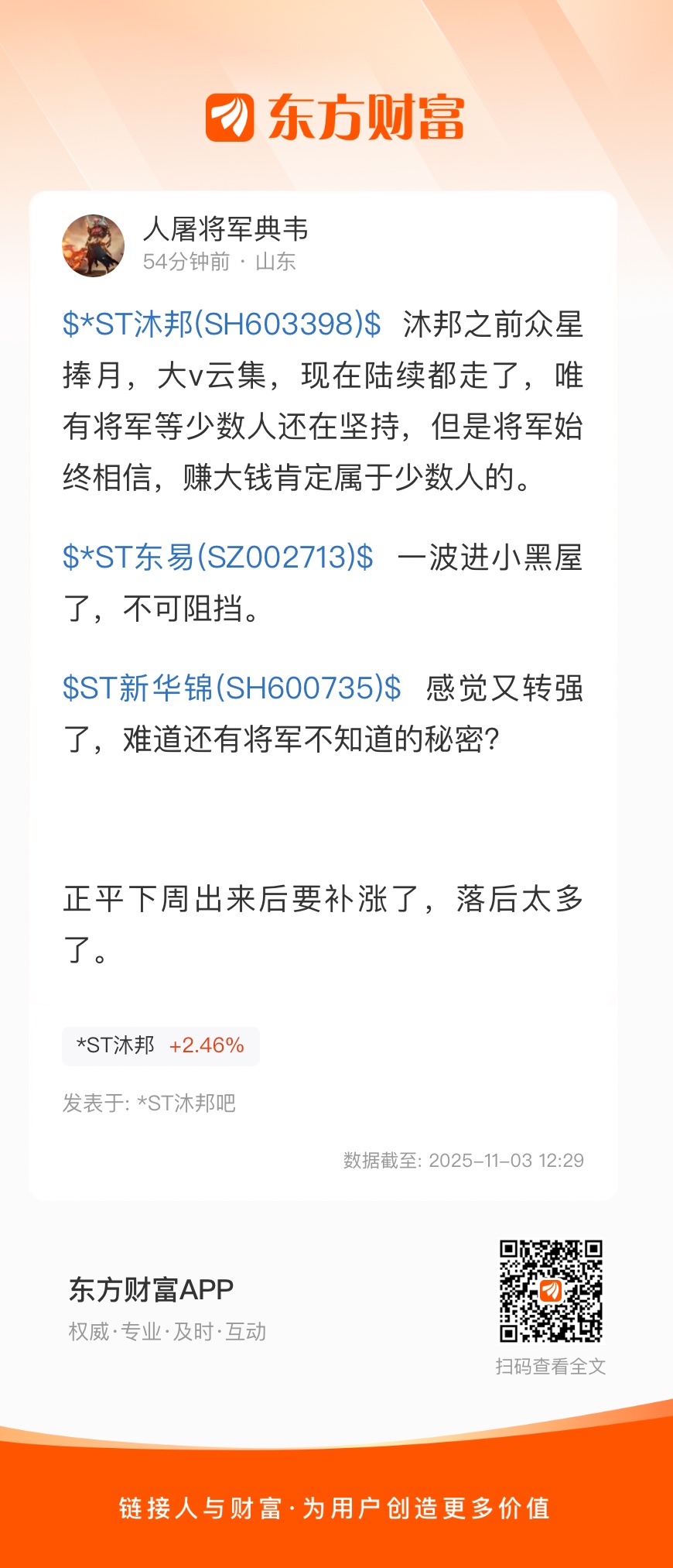$*ST沐邦(SH603398)$  沐邦之前众星捧月,大v云集,现在陆续都走了,唯有将军等少数人还在坚持,但是将军始终相信,赚大钱肯定属于少数人的。
