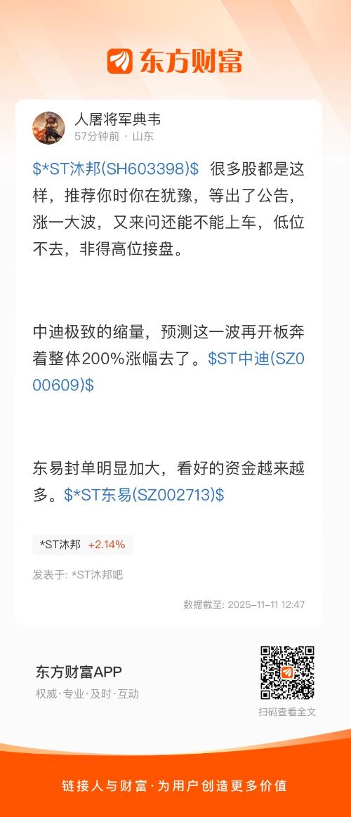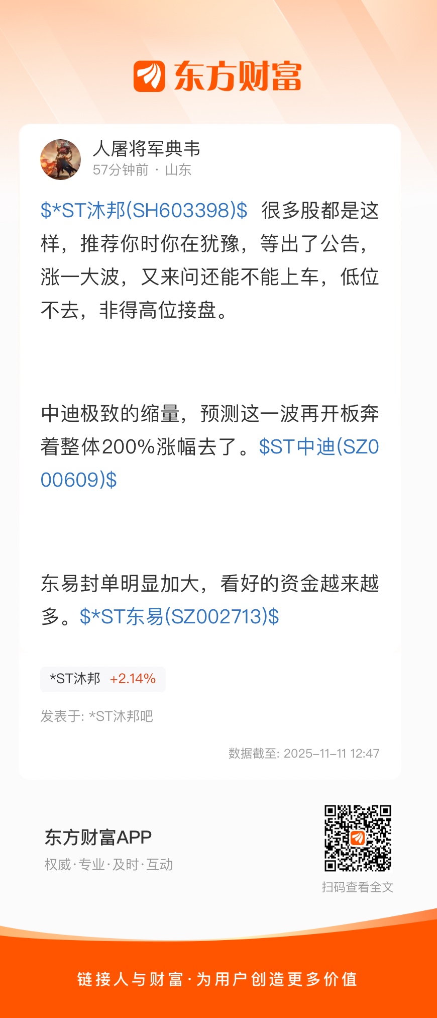 $*ST沐邦(SH603398)$  很多股都是这样,推荐你时你在犹豫,等出了公告,涨一大波,又来问还能不能上车,低位不去,非得高位接盘。