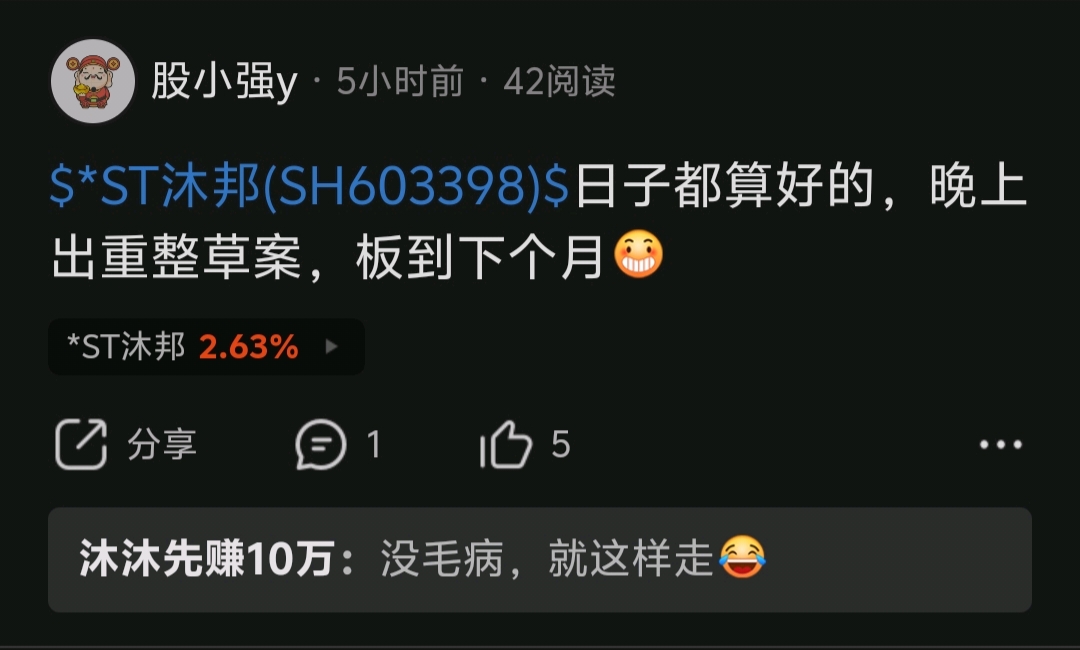$*ST沐邦(SH603398)$ 看时间,下午我说没人信!还有人骂我!哎!
