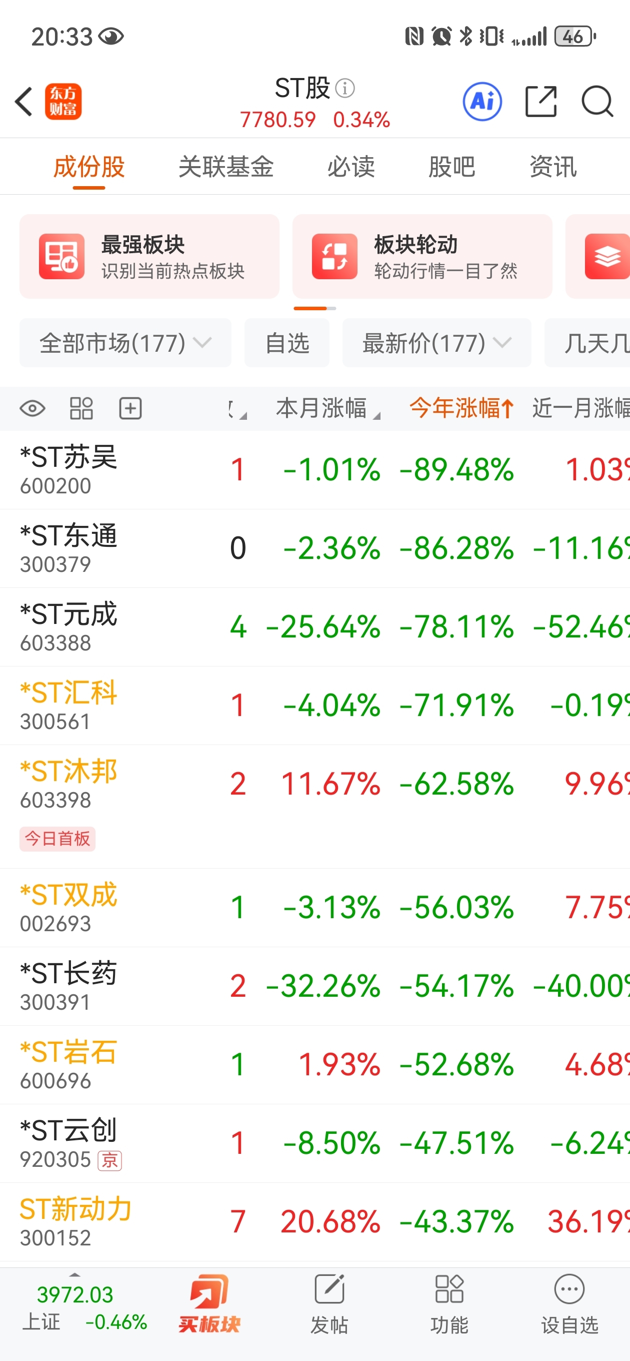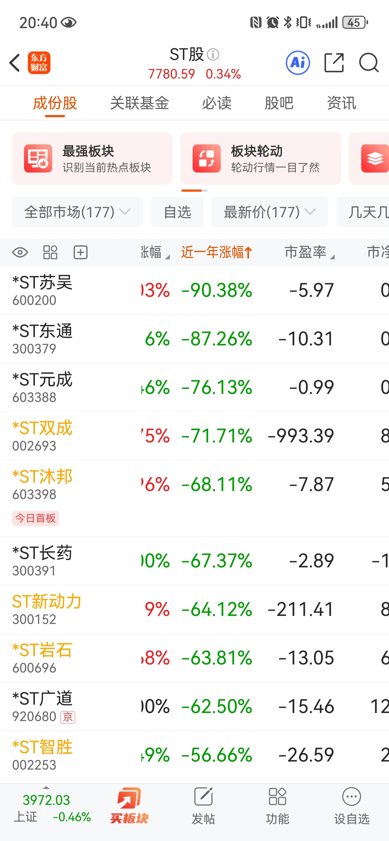 $*ST沐邦(SH603398)$ 扣掉3必退的,今年跌幅排名第二,近一年跌幅更厉害,跌幅68.11%,也是第二,应该也是5000多家跌幅排名第二,第一名跌幅换了,近一年和今年第二跌幅都是沐邦,综合跌幅,排名第一,如今国资重整,能涨到多少,自己发挥想象