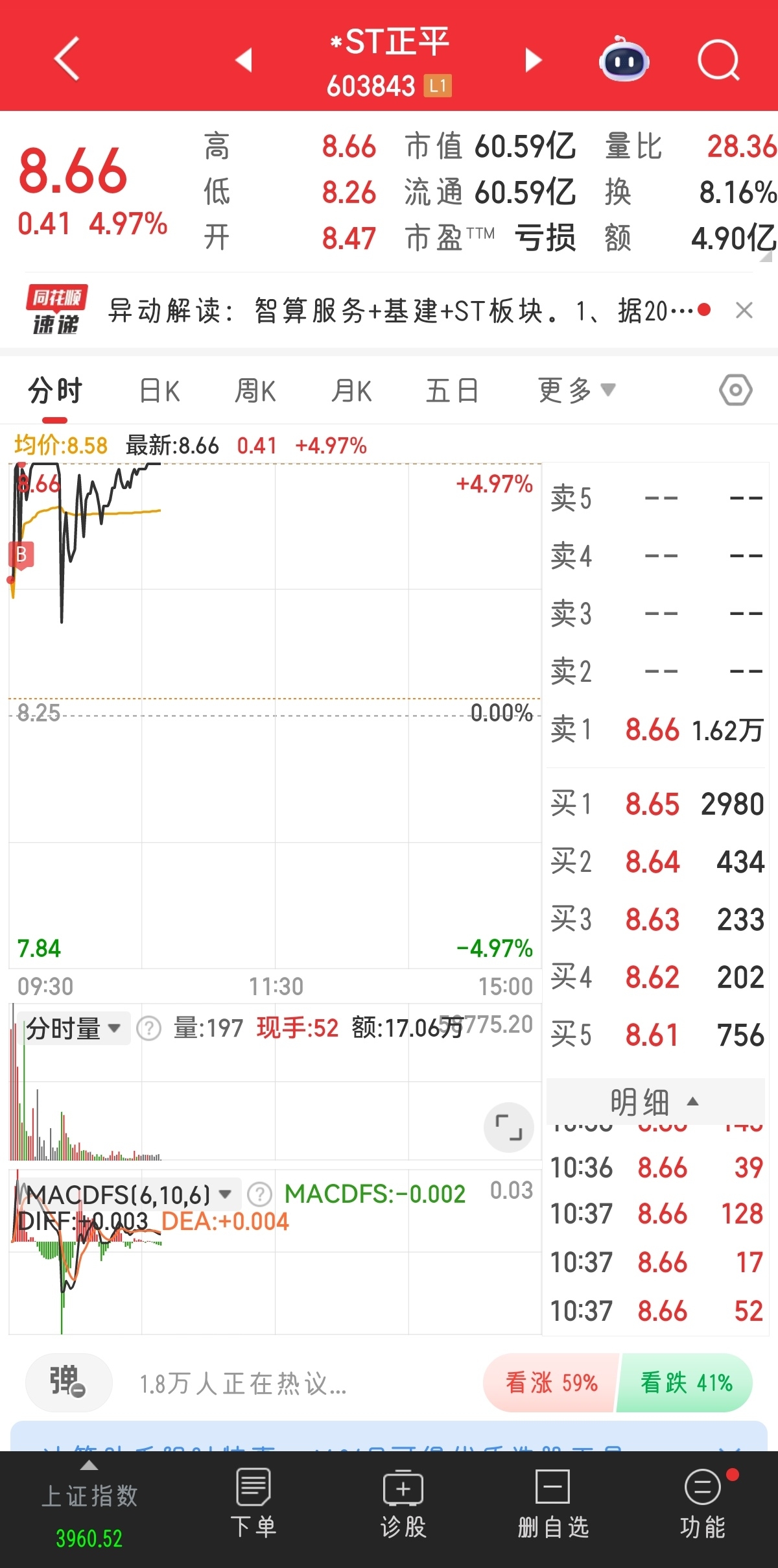 $*ST沐邦(SH603398)$ $*ST正平(SH603843)$ 老师们,平头哥我一股没卖,给机会就又奶了两口,都不带半点犹豫的。担心风险的老师们,卖出也没错,毕竟赚到了落袋为安,什么时候卖都是对的。