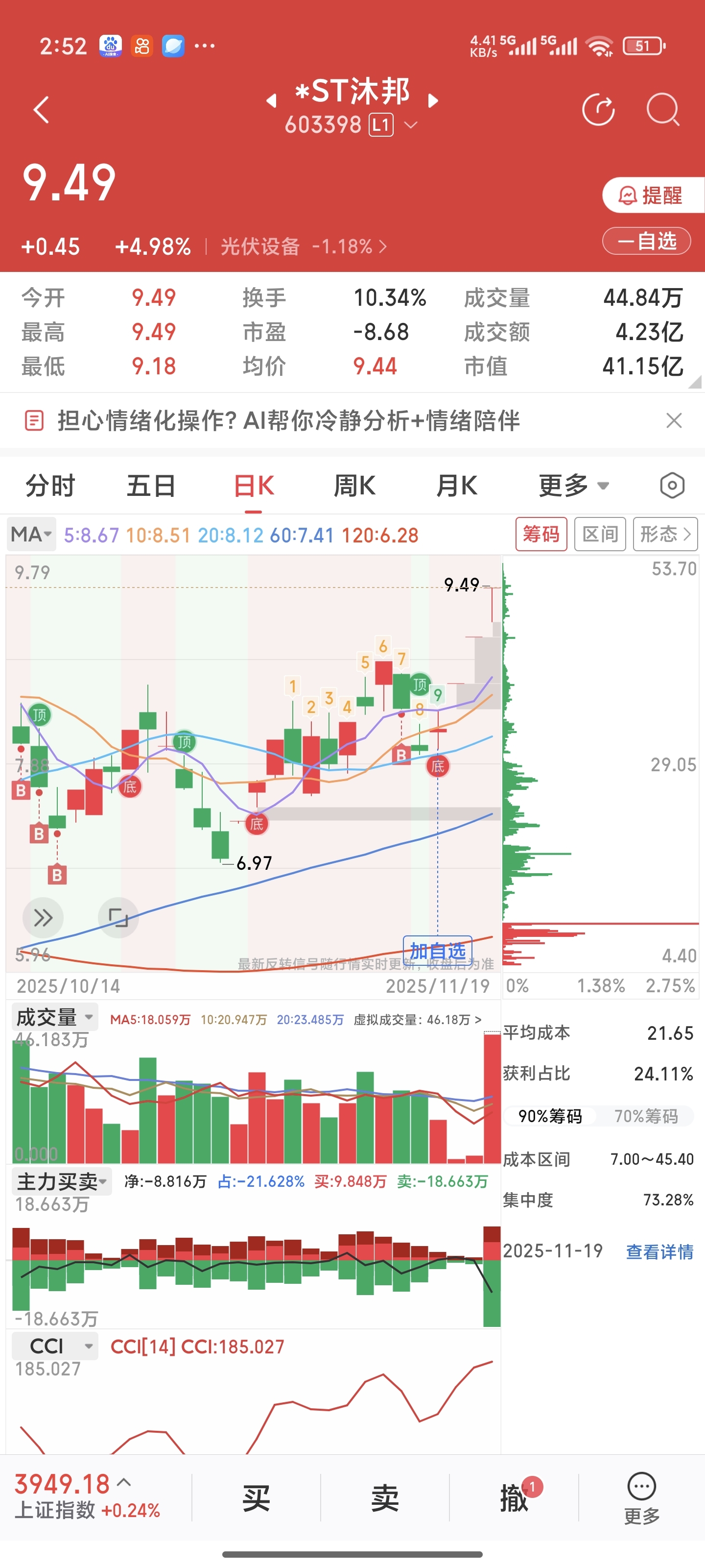 $*ST沐邦(SH603398)$ 今天突破前高9.44 且放巨量,承接获利盘出是好事啊,新鲜血液输入以后定是一马平川。明天开始一字板,一直到小黑屋镀金。恭喜今天没下车的,建仓的,加仓的赚得盆满钵满。