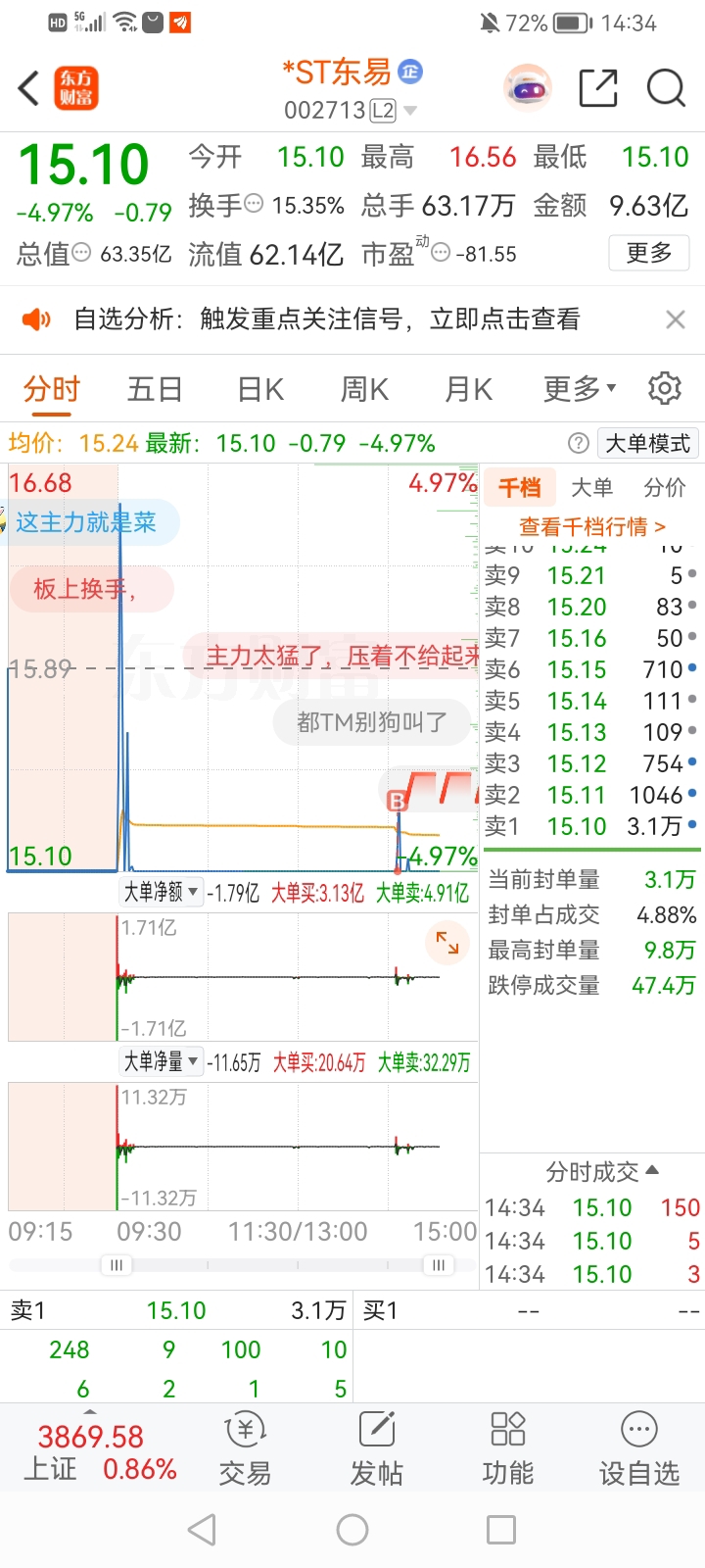 $*ST沐邦(SH603398)$ $*ST东易(SZ002713)$ 今天ST板块只有两个跌停板,二选一买了东易,因为东易回调了四个地板而沐邦才回调了两个地板,没有想到沐邦快地天板了,而东易又回封跌停板了,气死我了!二选一总买错