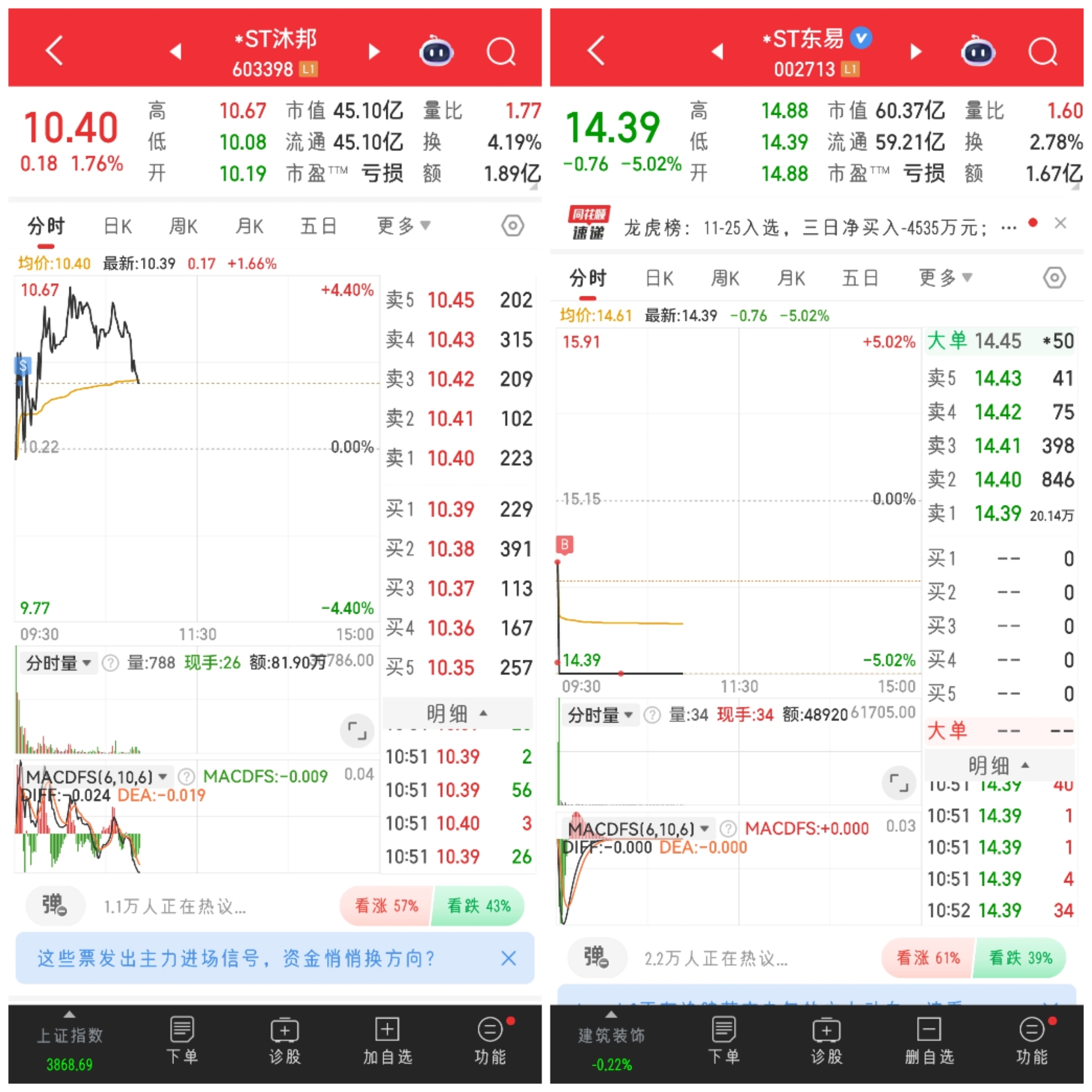 $*ST沐邦(SH603398)$ $*ST正平(SH603843)$ $*ST东易(SZ002713)$ 今天卖沐邦补东易,东易已经补到7成仓位了,连续吃了4个跌停,特别是今天这一跌停杀伤力太大了,跌的我有点迷茫,老师们,能否告诉我补的是对是错,欢迎留言互动。