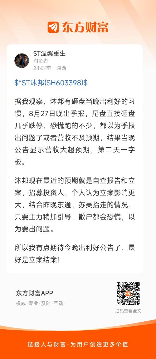 据我观察,沐邦有砸盘当晚出利好的习惯,8月27日晚出季报,尾盘直接砸盘几乎跌停,恐慌跑的不少,都以为季报出问题了或者营收不及预期,结果当晚公告显示营收大超预期,第二天一字板。