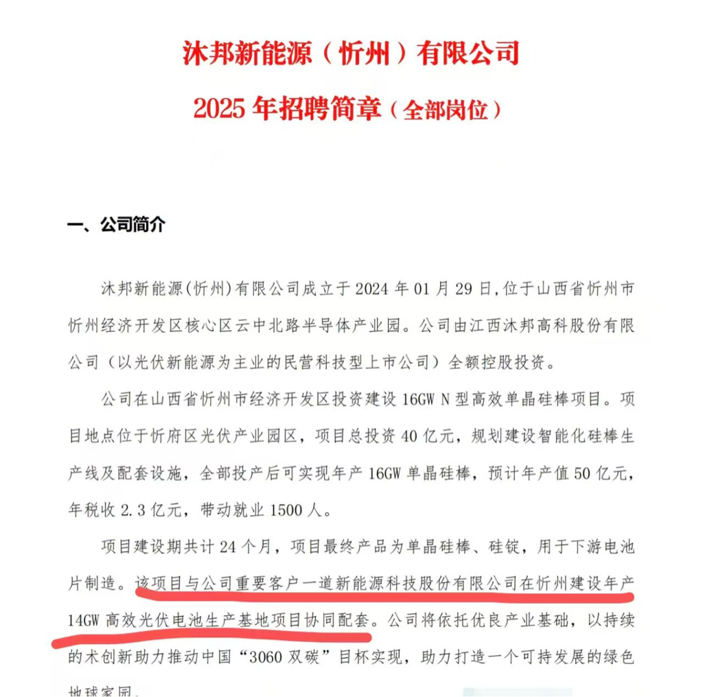 根据报道,沐邦山西忻州的项目,和一道新能今年的新项目,位于同一地址,产业园相隔仅一条马路!且,沐邦山西投资40亿的项目,就是专门供货给一道新能配套的!