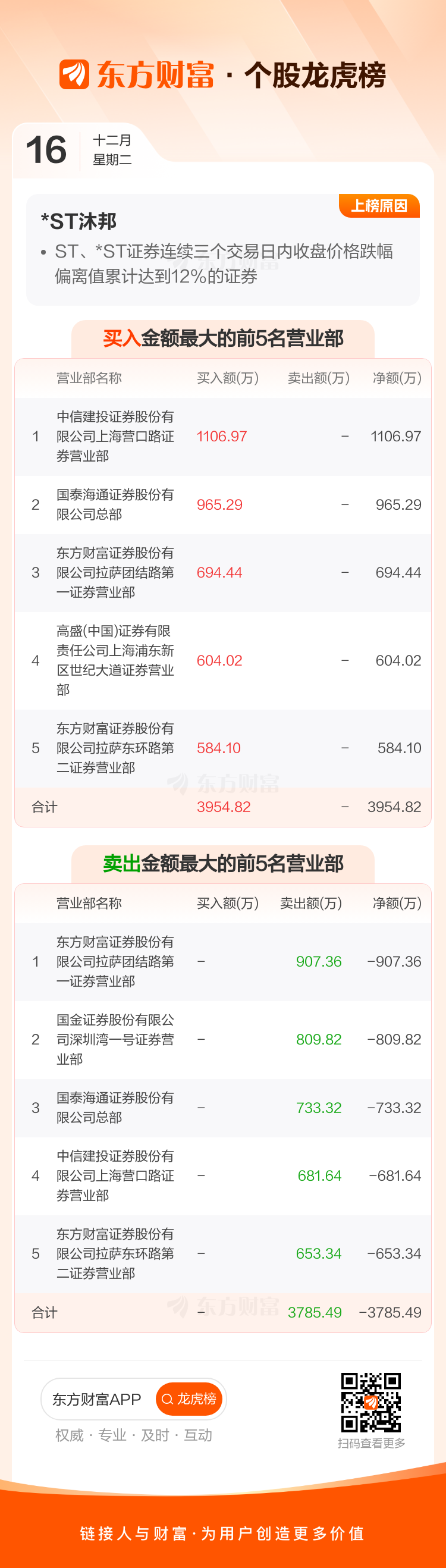 *ST沐邦(603398)龙虎榜数据(12-16)